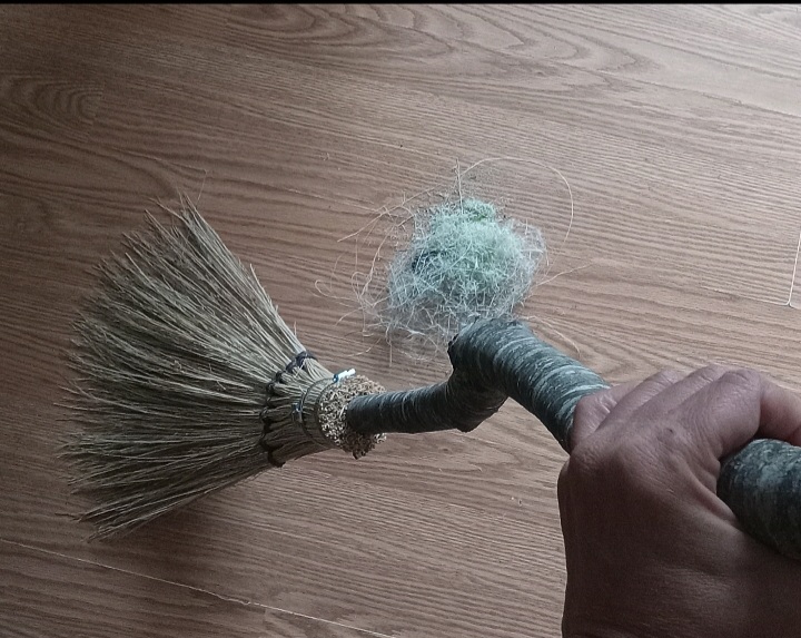 The broom does its job on the kitchen floor. I am considering making a mop with recycled fabric strips the same way.