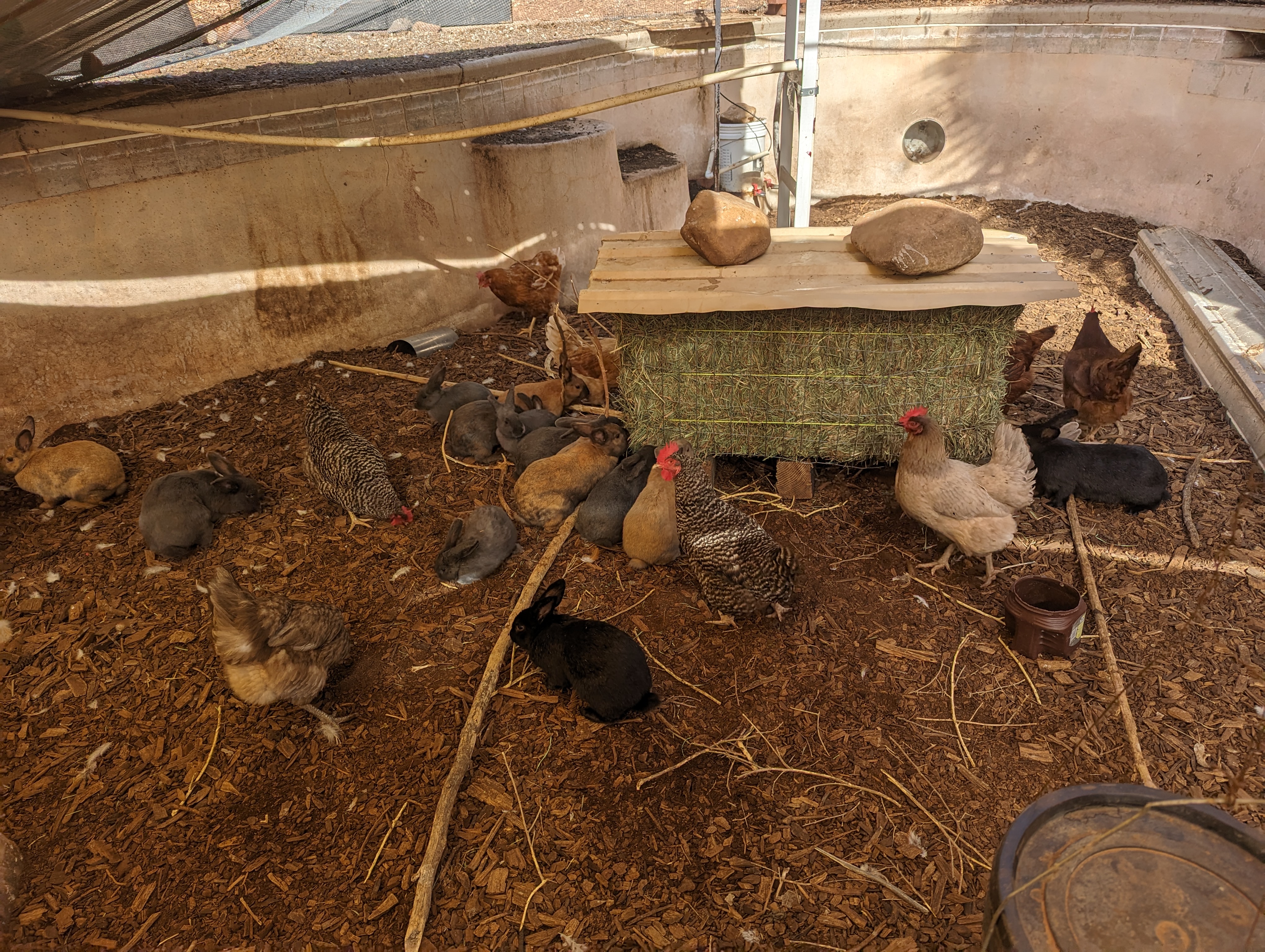 I've had my in ground concrete swimming pool filled with free wood chips for about 8-10 years now. It collects rain water (only 8" of rain per year here), towards the deep end. The wood chips are about three to four feet high in the deep end, and 2' to 3' are constantly submerged in the water. I find that digging down about a foot is the sweet spot for life, particularly worms. Oddly the anaerobic water smells sweet, and my chickens regularly drink it if I dig a hole deep enough. I will sometimes bury guts/carcasses into the pool, most of my yard waste, scraps, anything organic basically goes into the pool. I used to raise meat rabbits in there along with the chickens, but it was more hassle than it was worth for me so I stopped doing that.