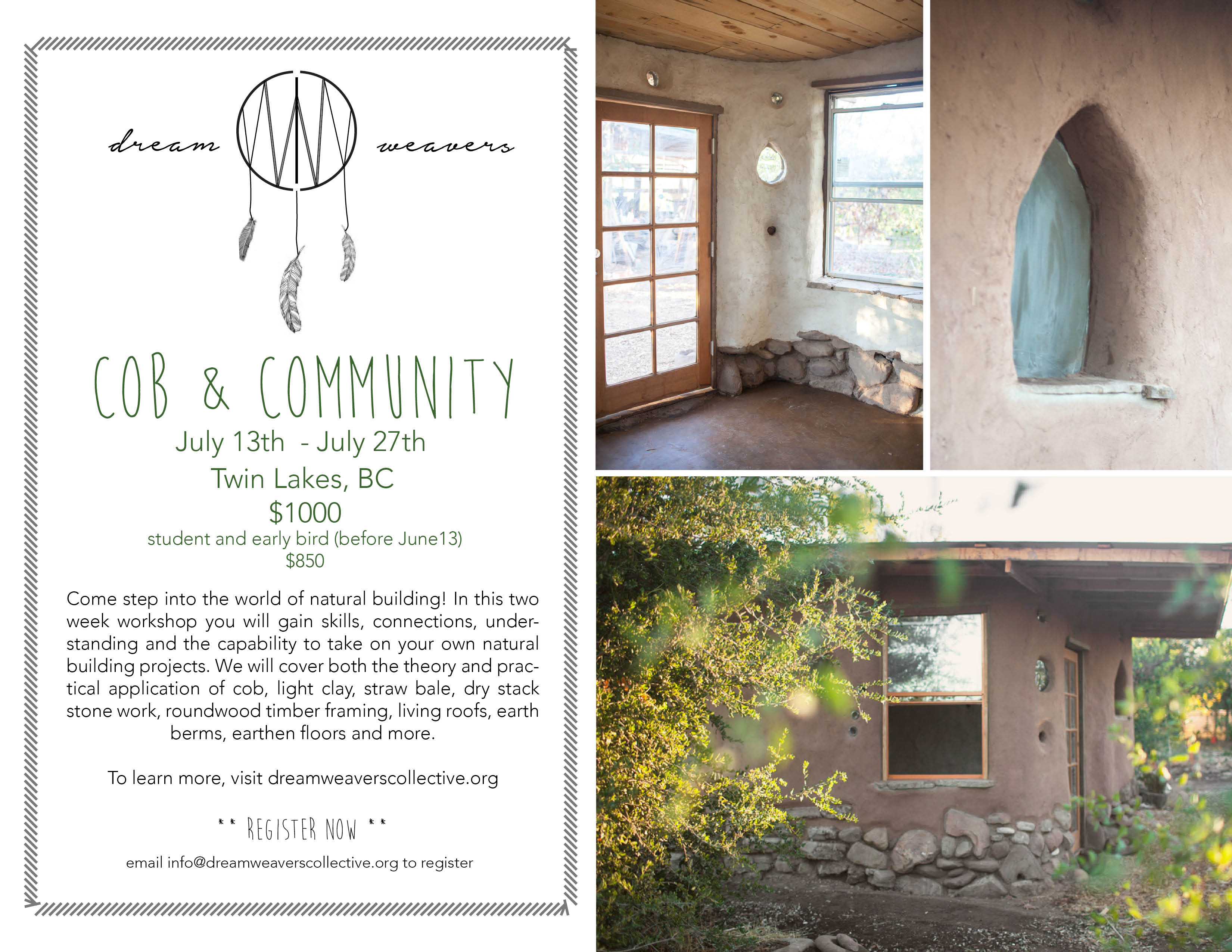 Dreamweavers Collective, a group of natural builders, farmers and permaculture enthusiasts is hosting a two week natural building workshop this summer in Twin Lakes, BC. Here are the details!