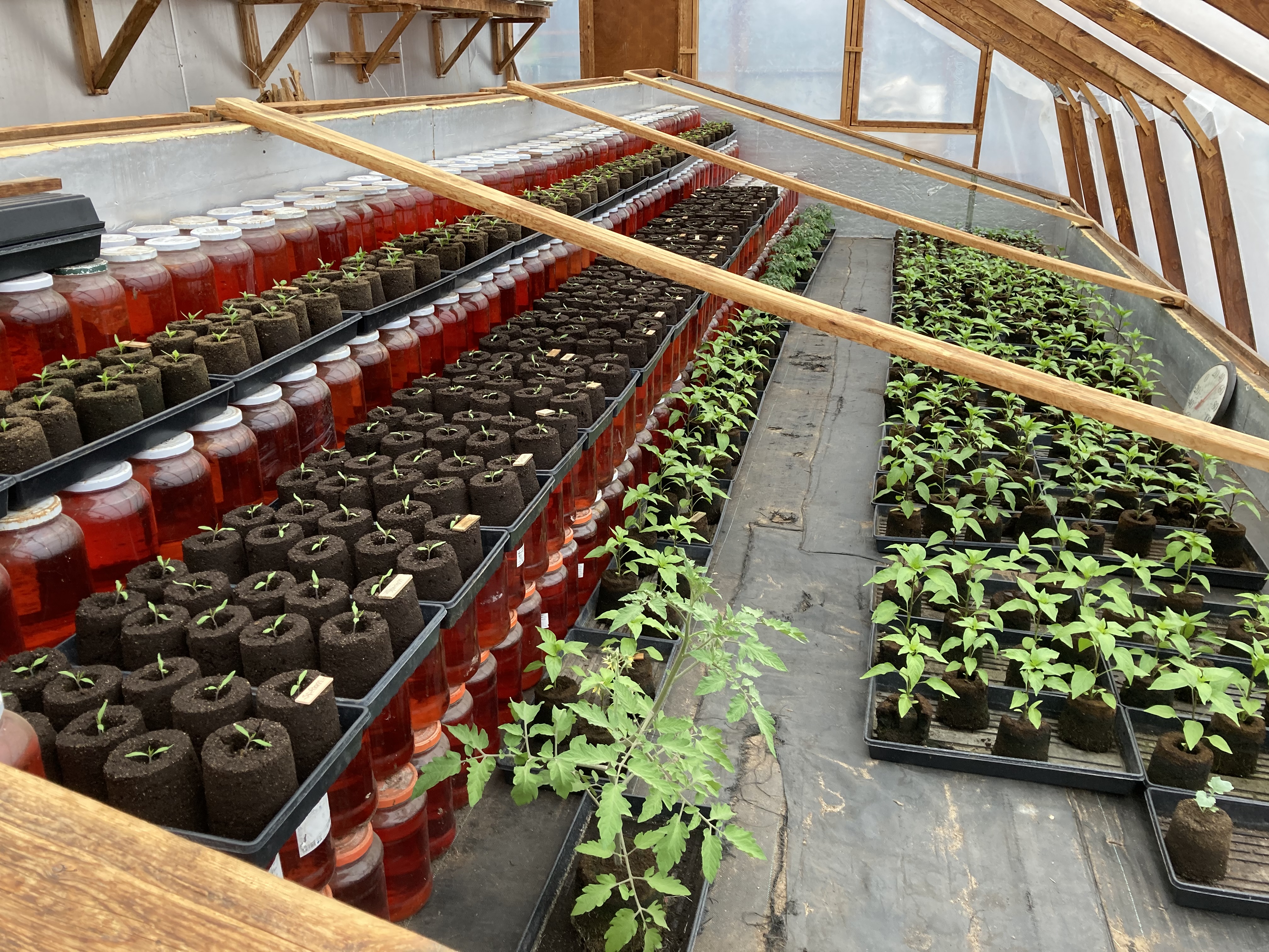 One of the pictures below shows a very unique “nation” I created, with a tropical plant, here in Michigan. Sweet potatoes desire a 85 degree soil temperature. That is not Michigan! So I mulched the full 6’x6’ area with small rocks. I had a soil thermometer there to check the soil, and it was often over 90 degrees. I had a wonderful harvest, with some rather large potatoes that came from that experiment. I will definitely do it again.