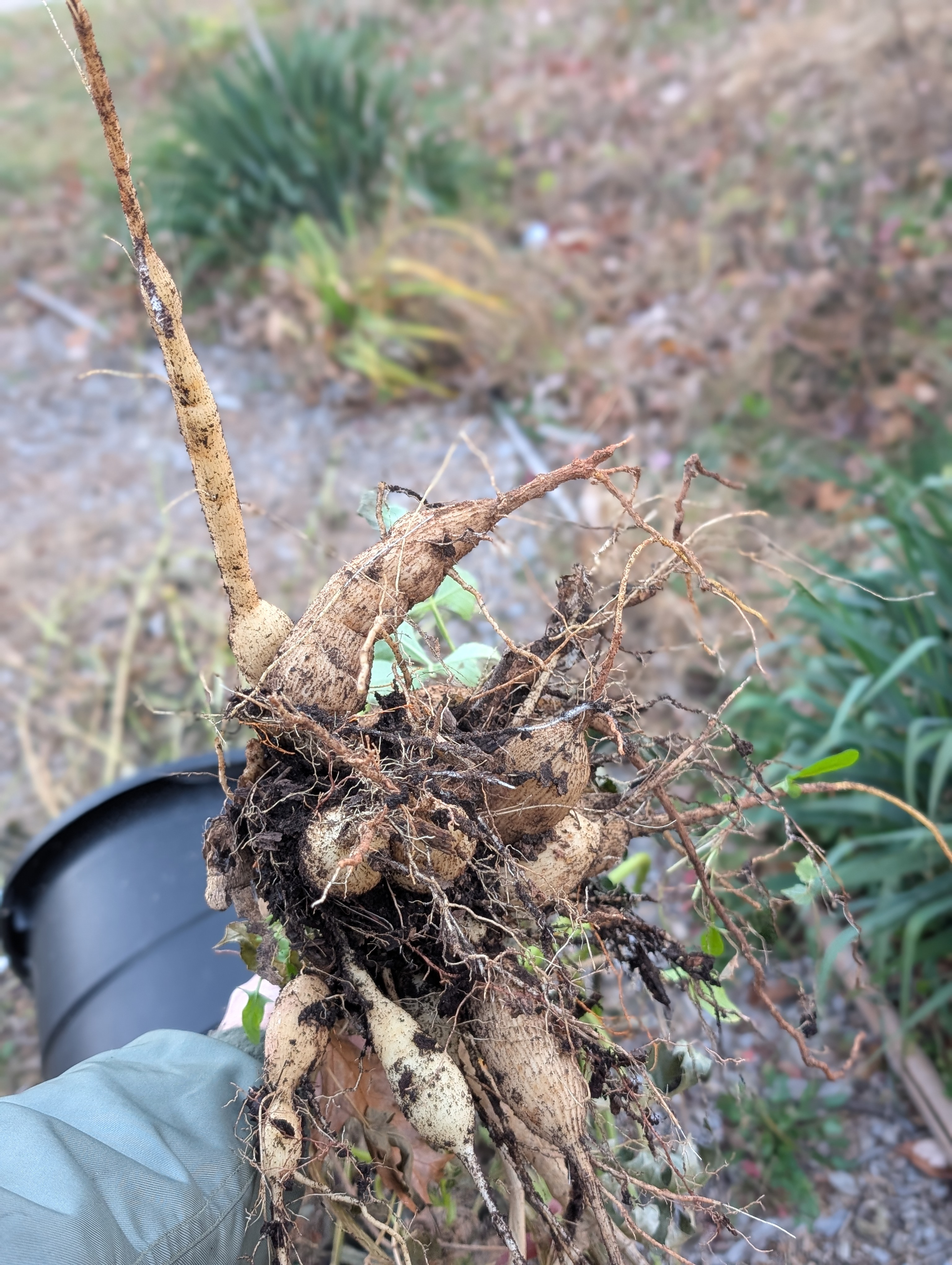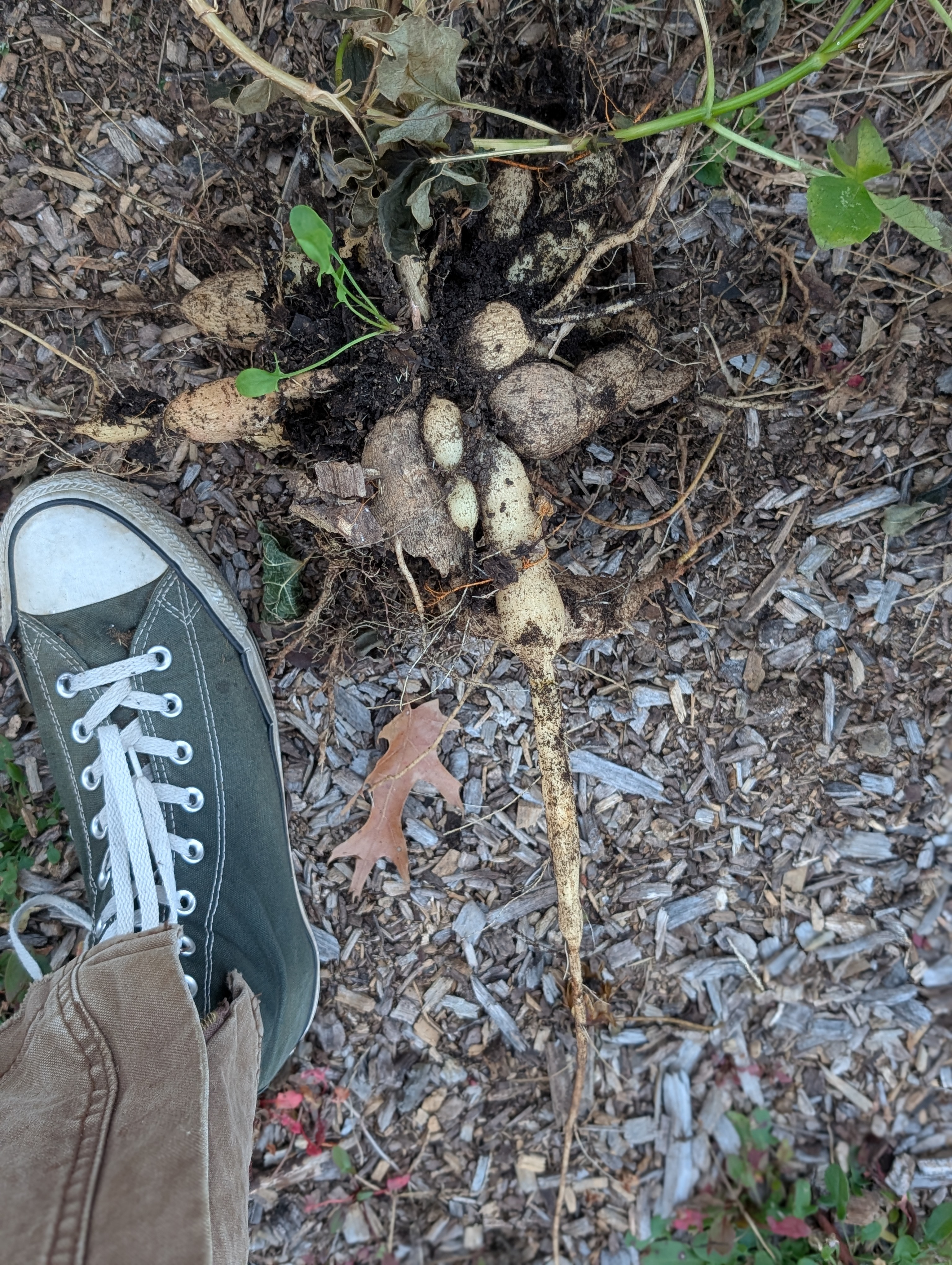 Now the younger plants only had a small handful of tubers each, but I was pleasantly surprised with the volume of tubers on one of our presumably older plants, shown below. One of the tubers was a full cubic in length! I'm digging them up to propagate and move to more advantageous locations come spring.