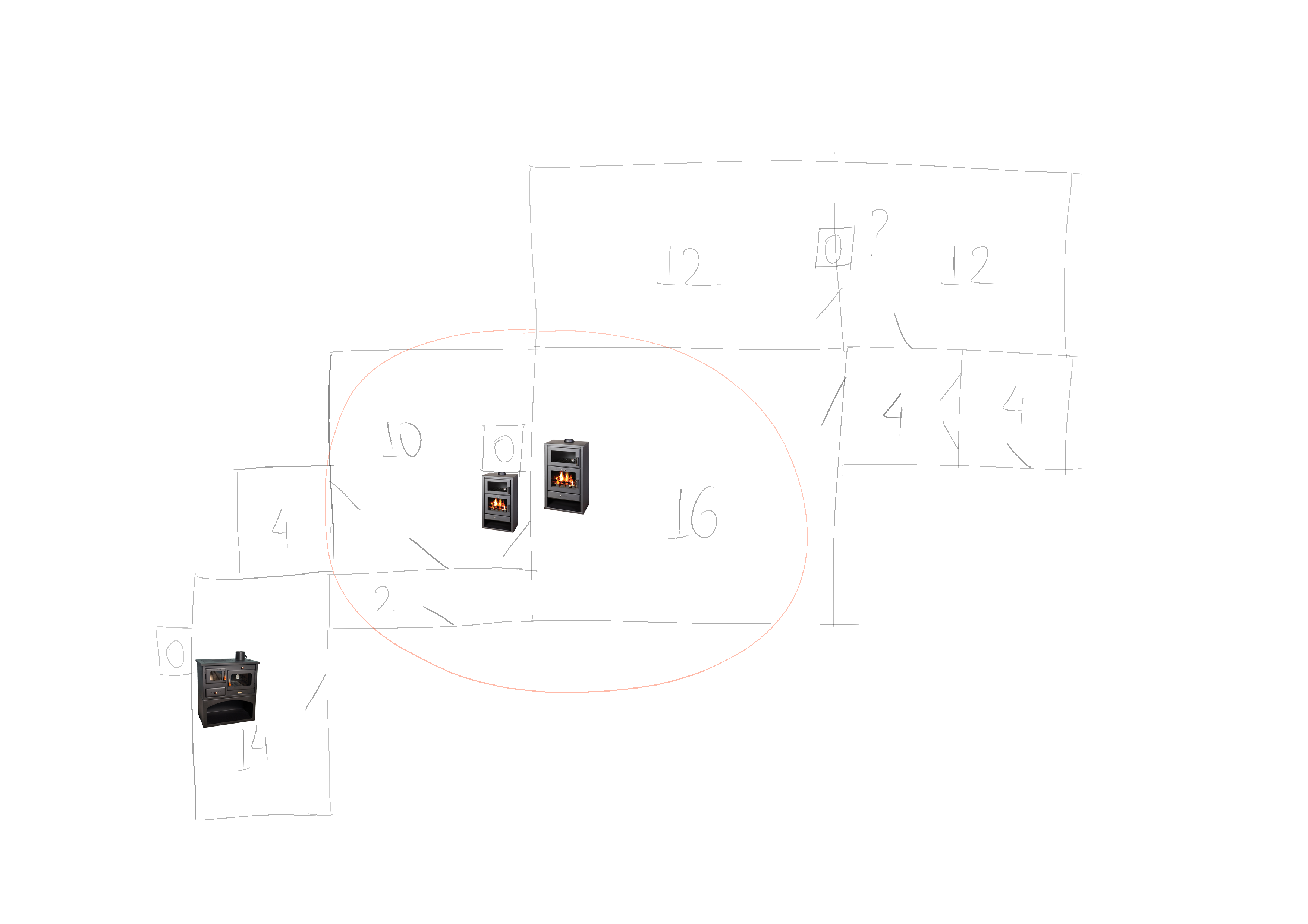 In the two drawings below (sorry for the not straight lines, I have not drawn in a while) you can see the main house, kind of strange shape. The first image is from top, second is from the side. Not all of the rooms are used at the moment. Only the circled in red two rooms and the two smaller to the left of them. The number in each room is the area in square meters. Those small rectangles with circles inside are chimneys. You can see what kind of stoves we use now for heating. I would like to replace at least the two central stoves with one rocket stove to heat both rooms and if possible more. Since I am familiar with these metal stoves, I am thinking to make a metal rocket stove that looks like them and then put bricks around it to store the heat. Probably will place it in the room 16m2, because it is in the center of the house. For heating the other room, I was reading about getting the hot air from around the stove or from the exaust with metal pipe, which goes through the wall, then inside more bricks, before it goes to the chimney. I do not want to make benches, more like something shorter and taller. Maybe building the stove and channels entirely from bricks would be better, but I think my grandmother will not like it. And it is not portable, in case we change plans. I also plan to make one with furnace for baking, maybe to replace that bottom cooking stove, but it seems a lot more complicated for now.