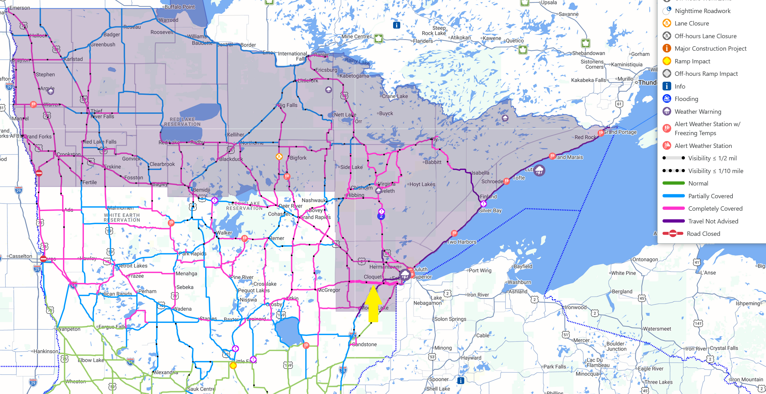 Minnesota Department of Transportation places us in the "do not travel" part of the state: