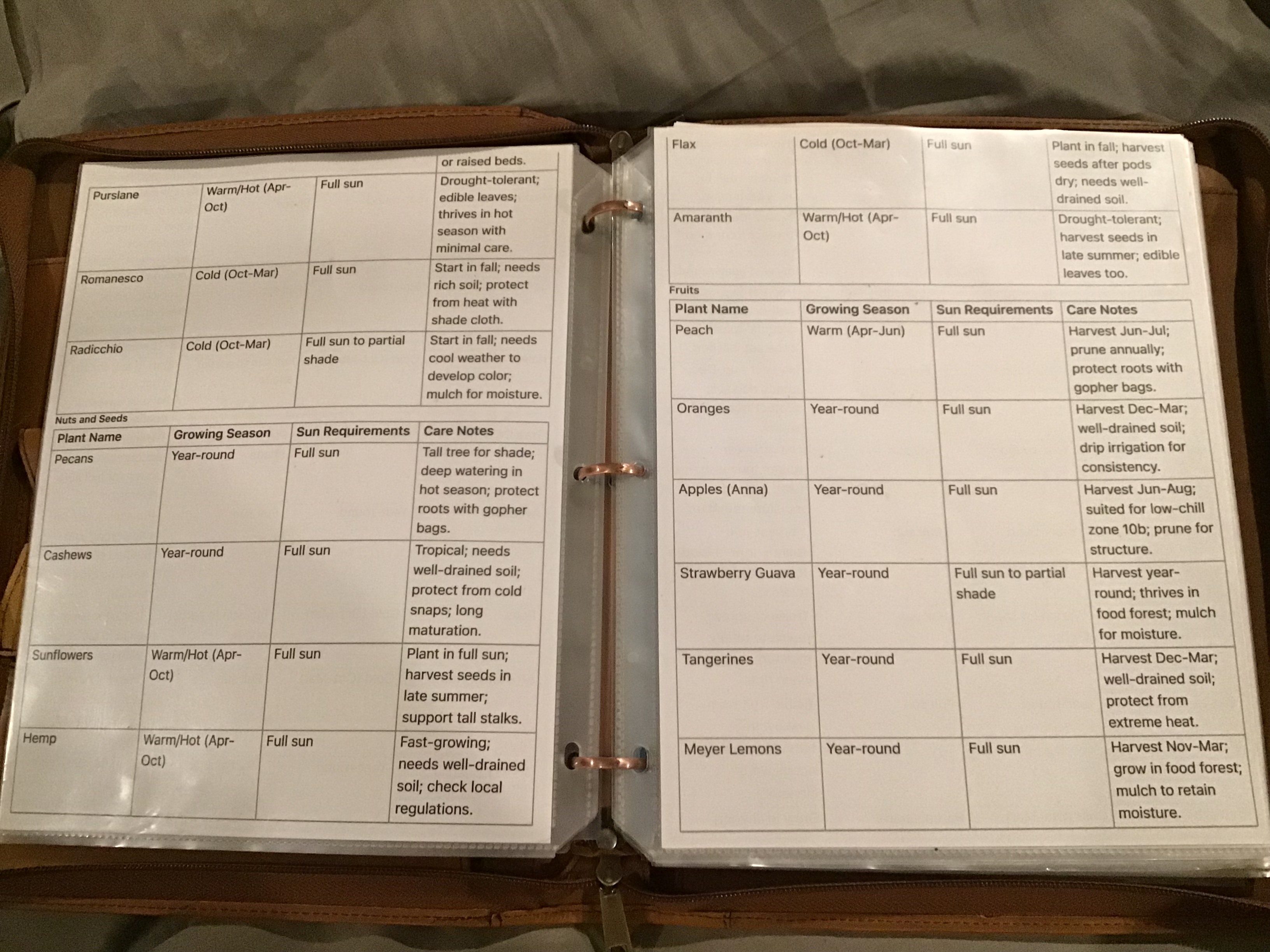 It has a calendar that shows our fruit and berry harvest times. My goal is to have fruit and or berries available fresh year round. It has a plant catalog of what we grow, but only a short line on when to grow with a few notes. Last it has a list of medicinal uses and plants I want to try in the future and notes on companion planting.