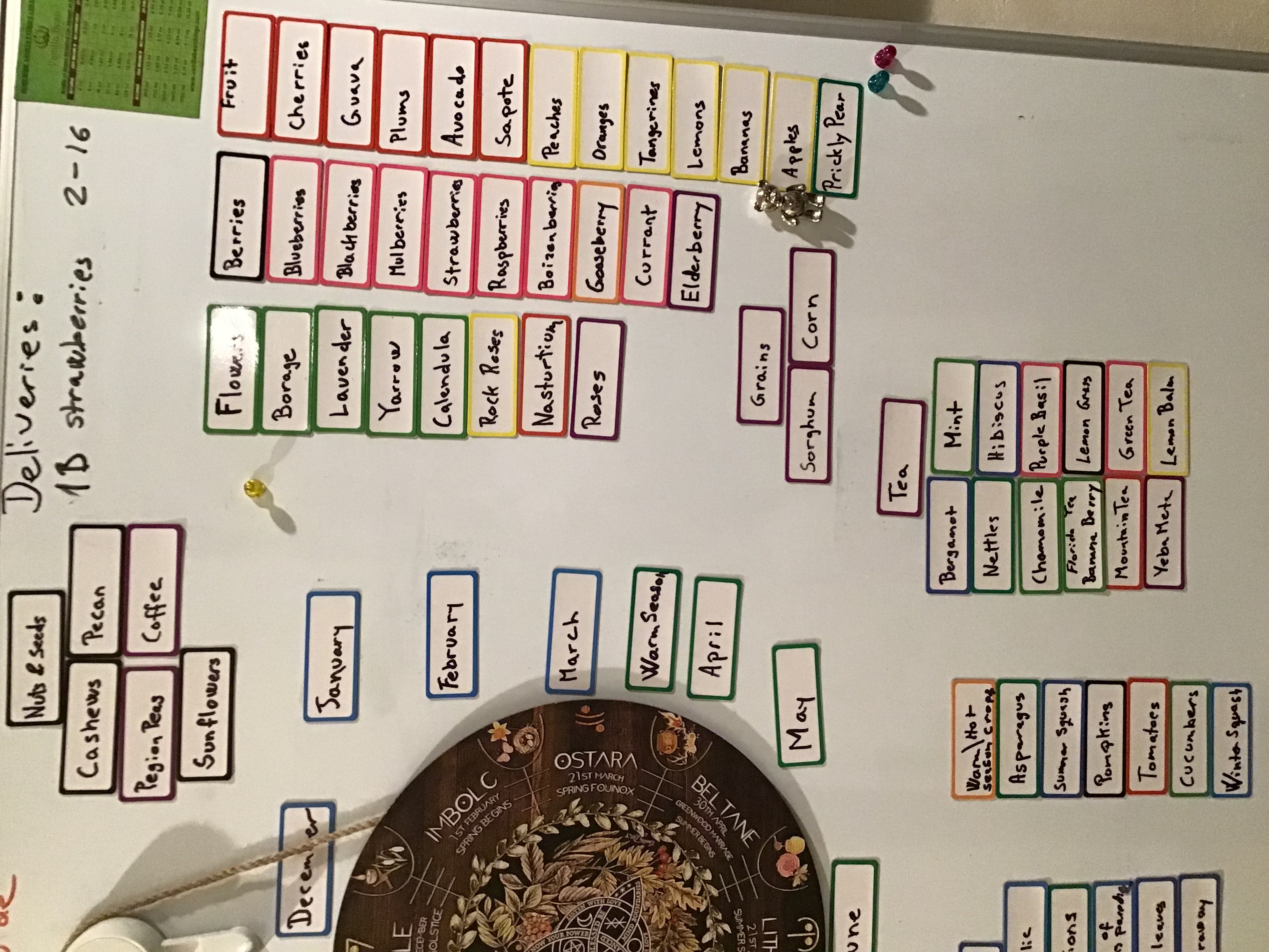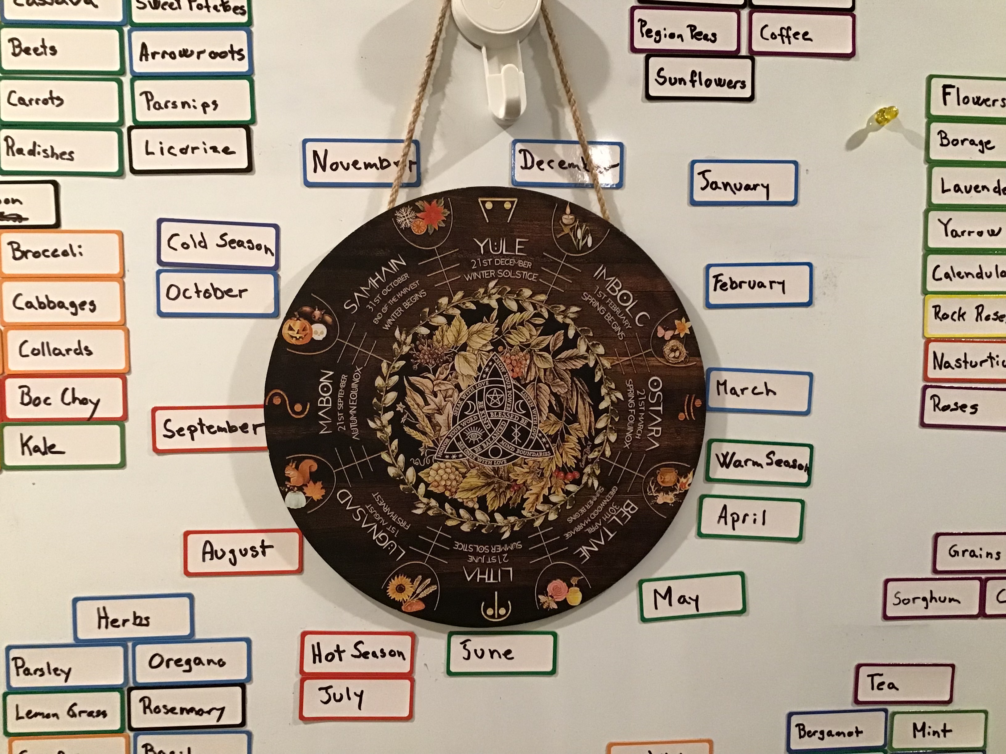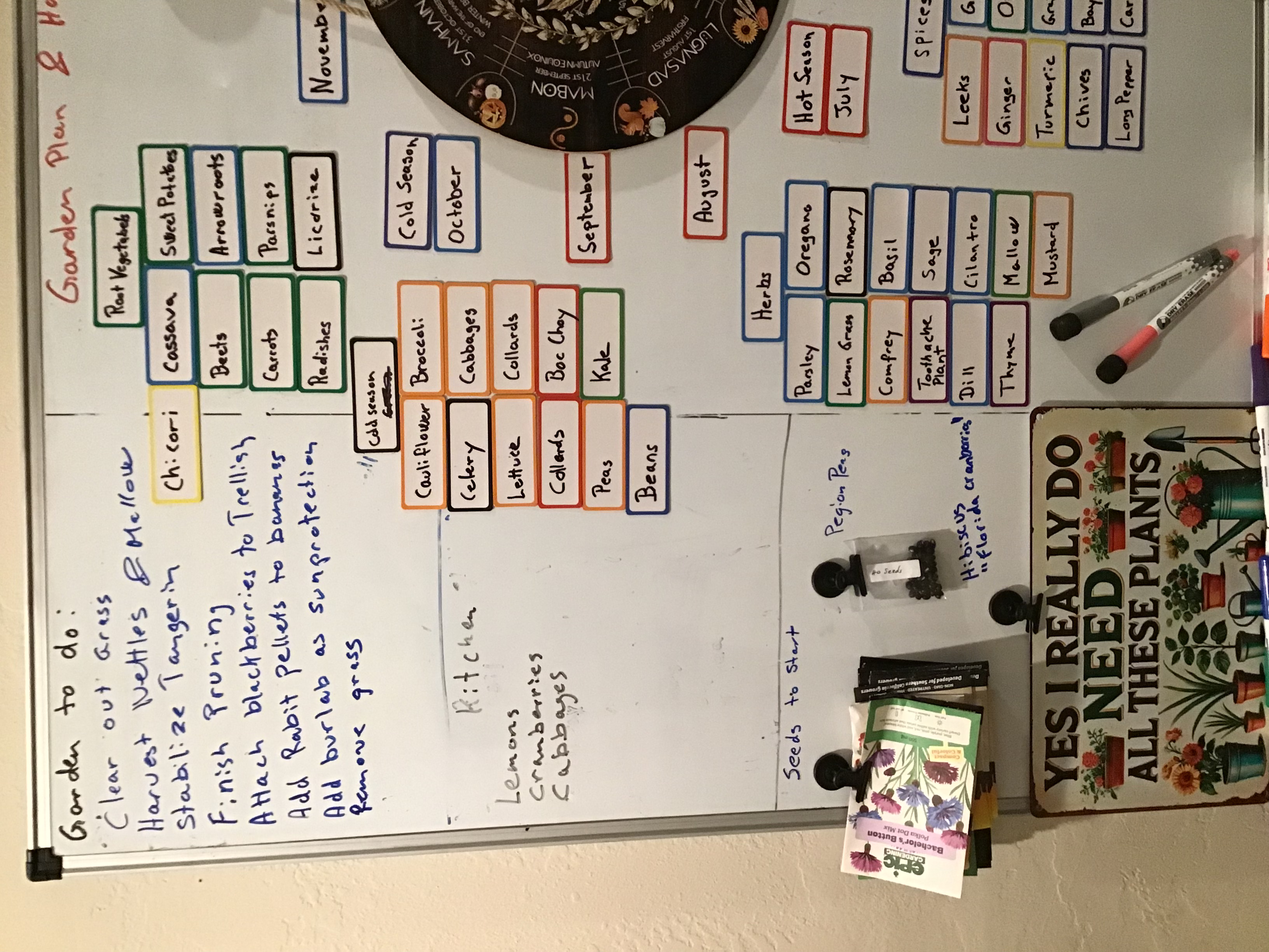 The whiteboard centers around a round calendar divided into our three growing seasons (cold, warm and hot) and surrounded by the plants. It also has my todo lists and deliveries. When my kids are here, they check the board and usually take care of some of the things on the todo list. Plant names are on magnets, that also works on the metal plant markers I use in the garden, so I don’t forget what I planted.
