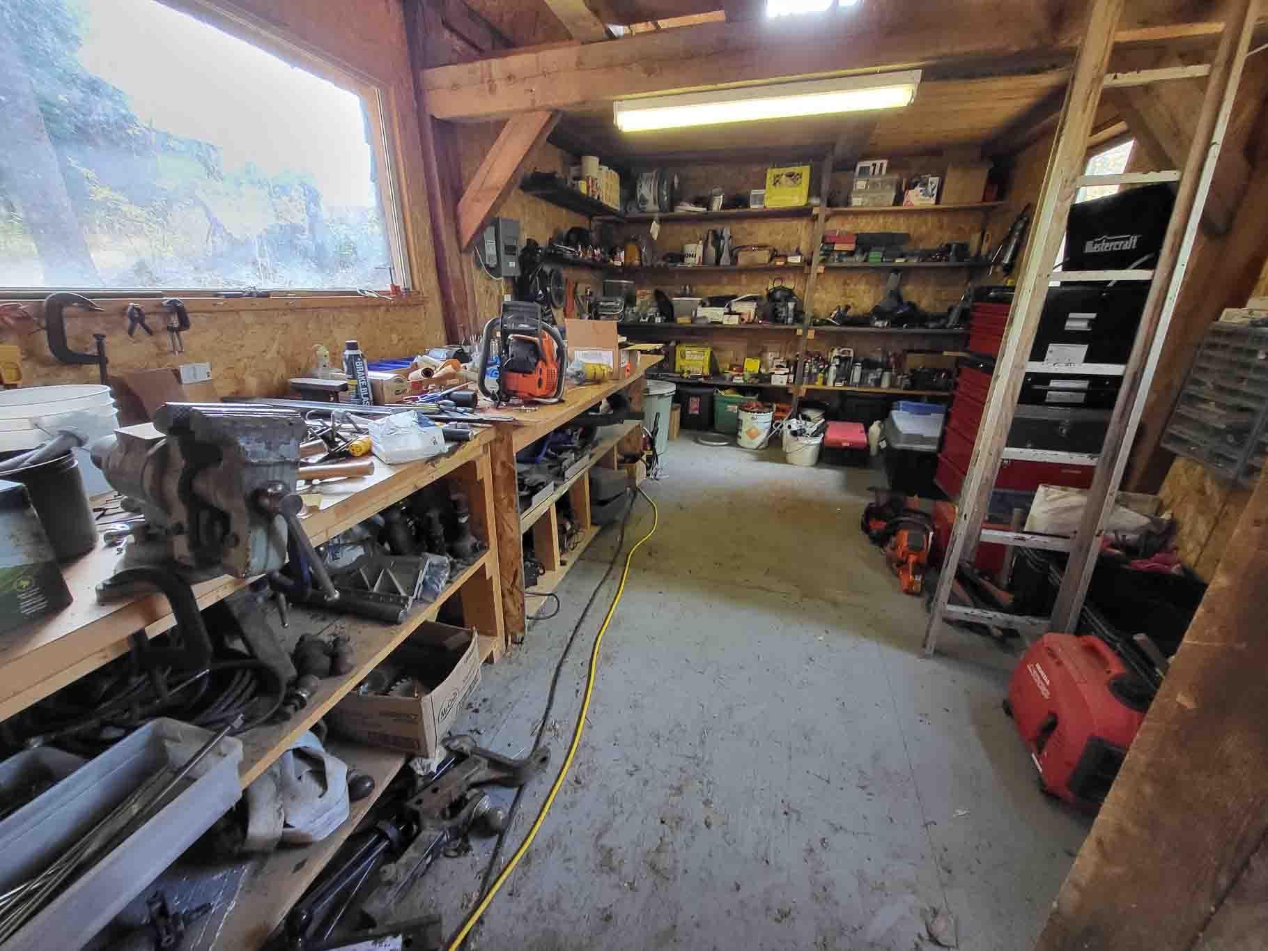 Large workshop, guest cabin (post-and-beam), garden shed, storage galore