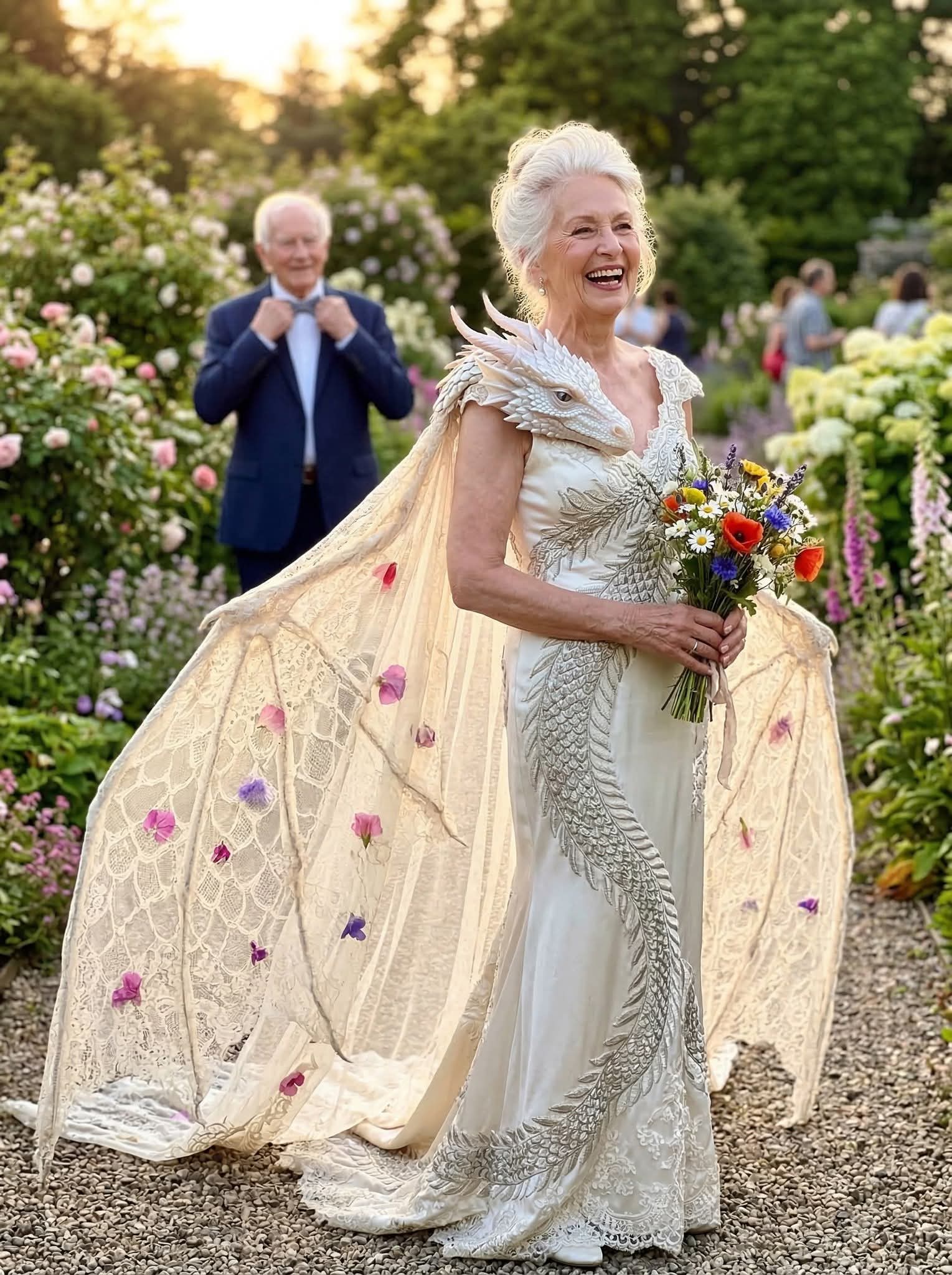 Grandma told the designer she didn't want a "sensible" lace suit. She wanted to look like she just stepped out of a legend. This gown was a collaboration between a master lacemaker and a woodcarver who did the resin headpiece. She said after 50 years of marriage, she’s earned her wings—so she made sure they were 15 feet long and attached to a dragon. She looked absolutely powerful walking down that garden path.