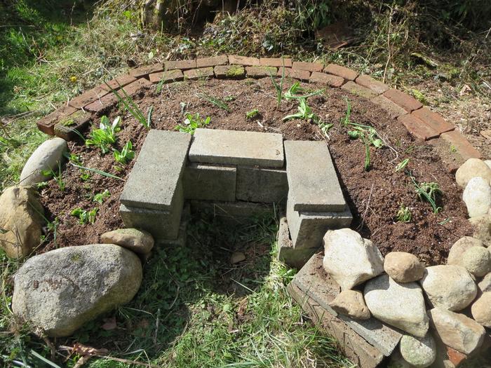 Remade Keyhole garden. It's full of perennial sorrel, leeks, chives, and walking onions. Perfect for year-round munching!