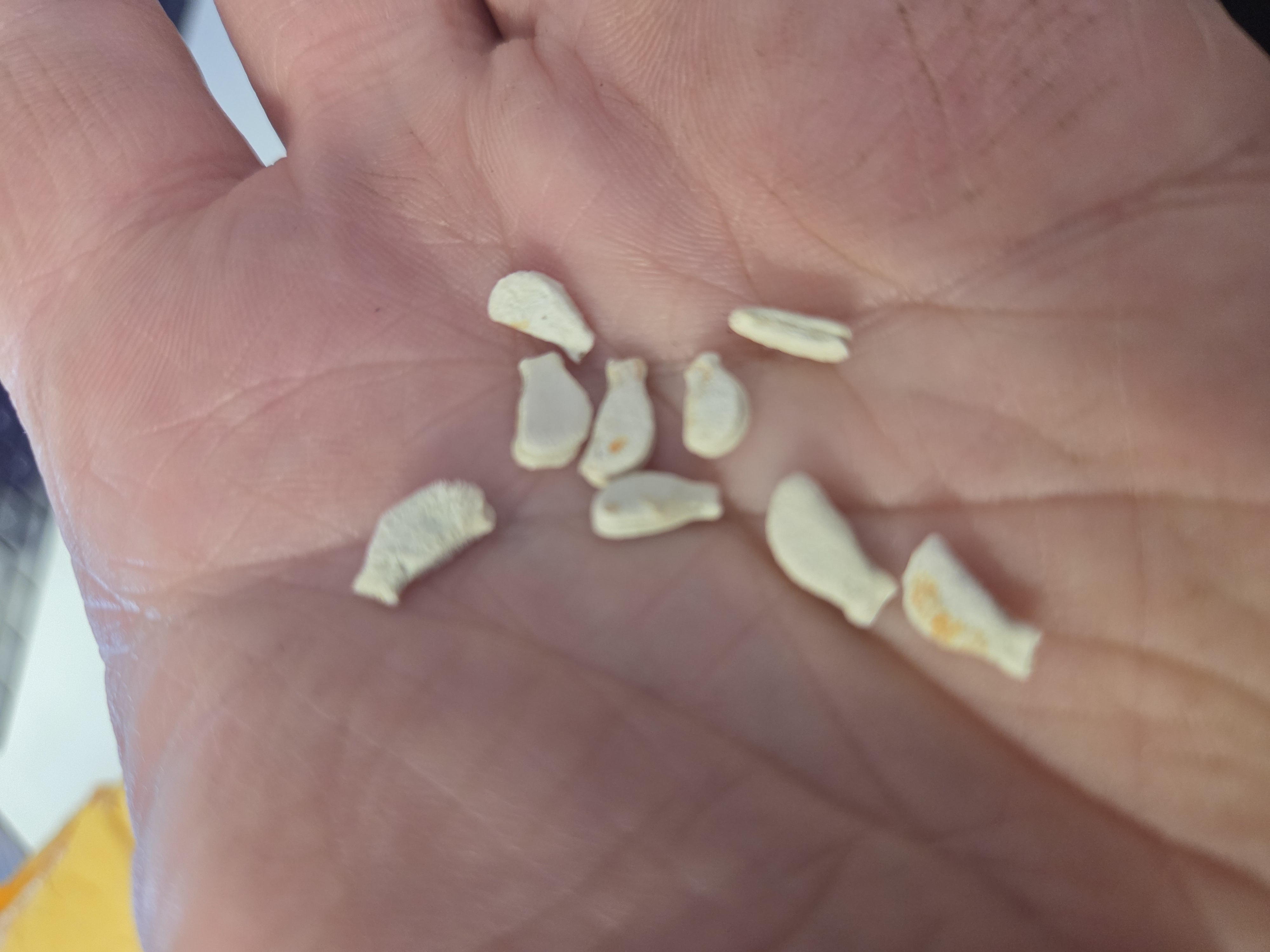 The seeds look almost like a thick flat cucumber seed ( which kind of makes sense since it's in the Cucurbitaceae family). I filed down a tiny part of the shell since they are so hard and soaked them for 24 hours in warm water before planting them about .5 inch in a mix of sand, perilite and coco coir. The shell was not very thick so i just lightly sanded it down.