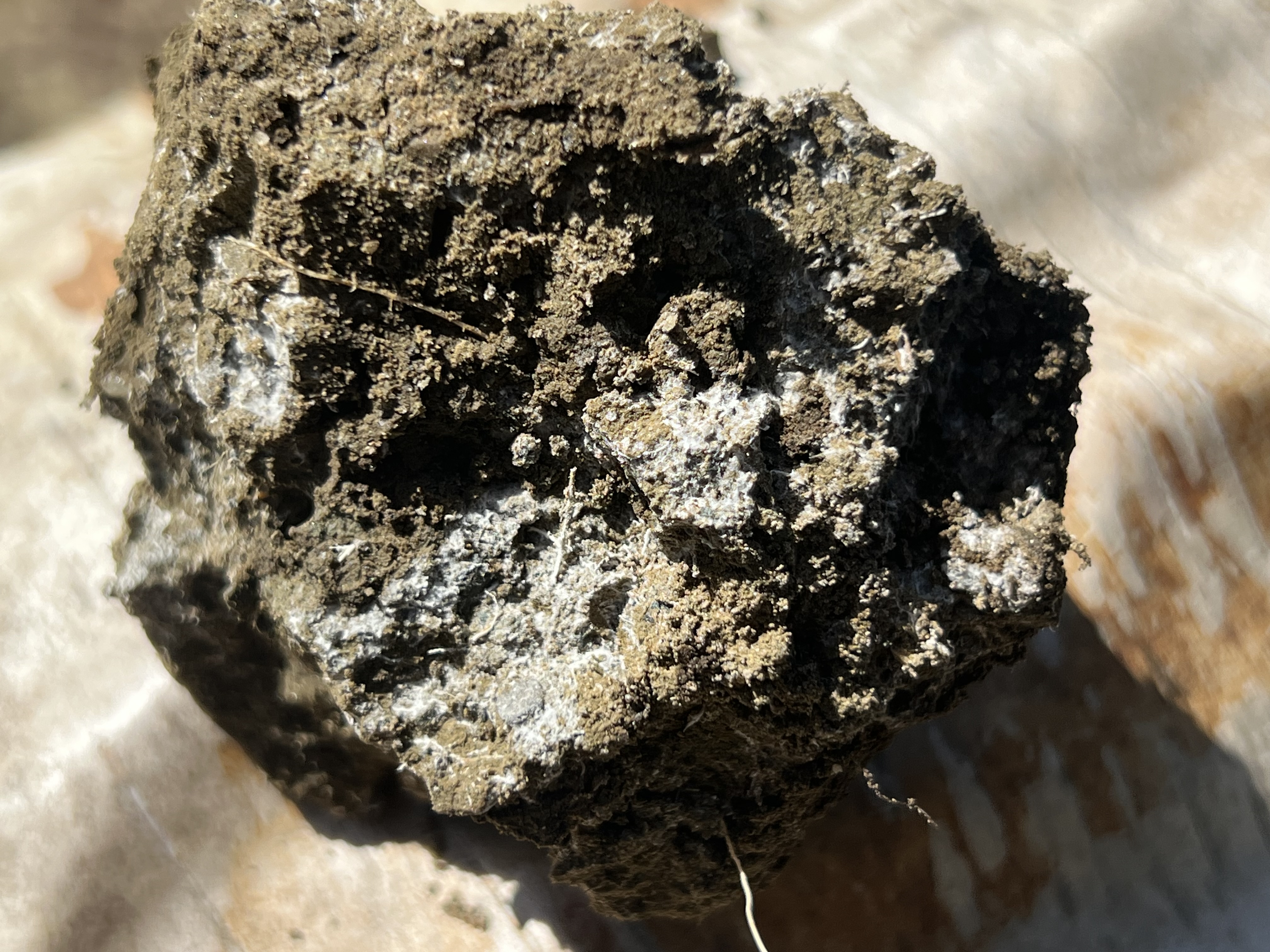 There is so much life—fungus? Burdock root hairs? I am not sure what, but this dirt is certainly being transformed. Last year, it had been all shaded by a big burdock plant.