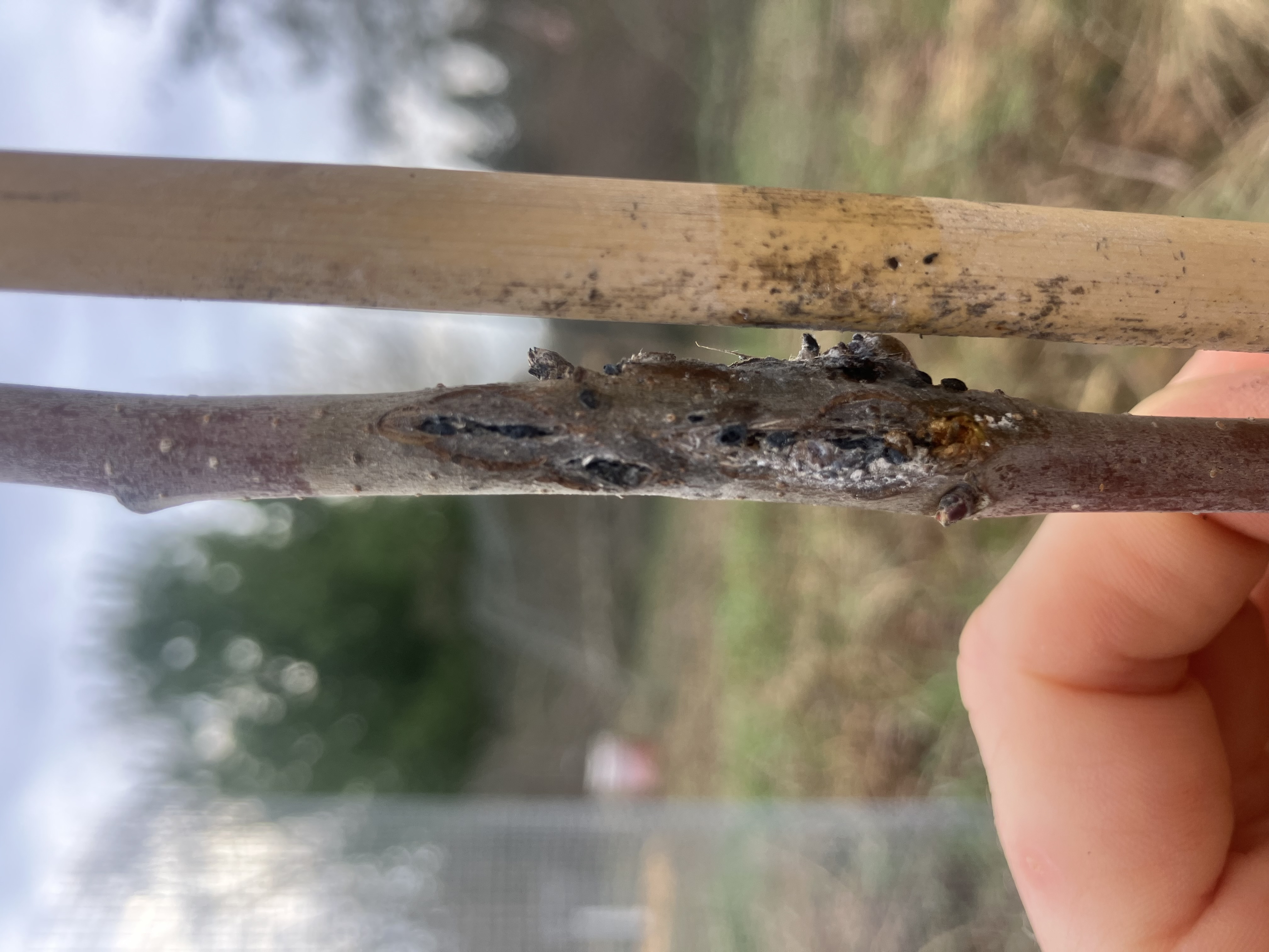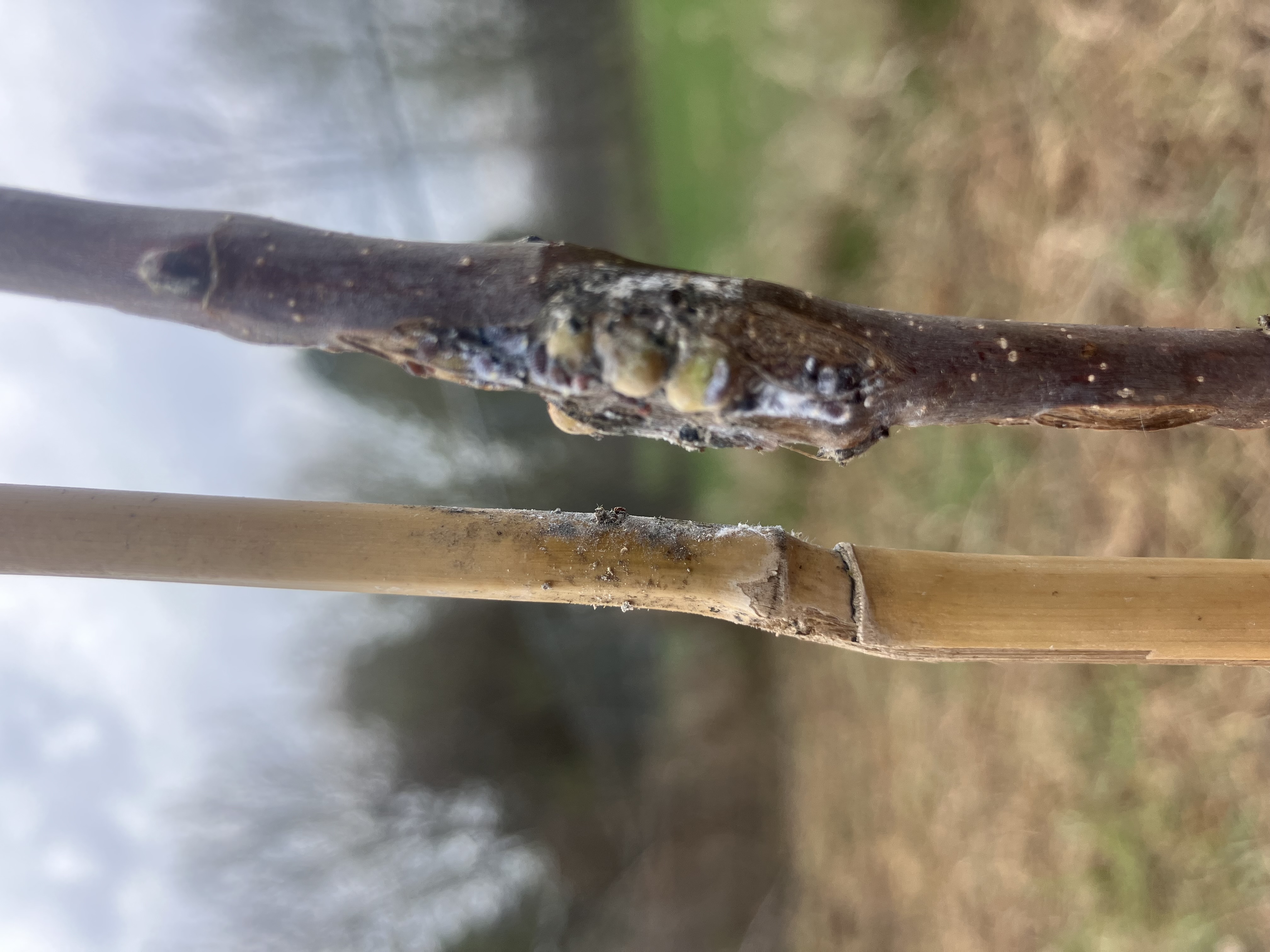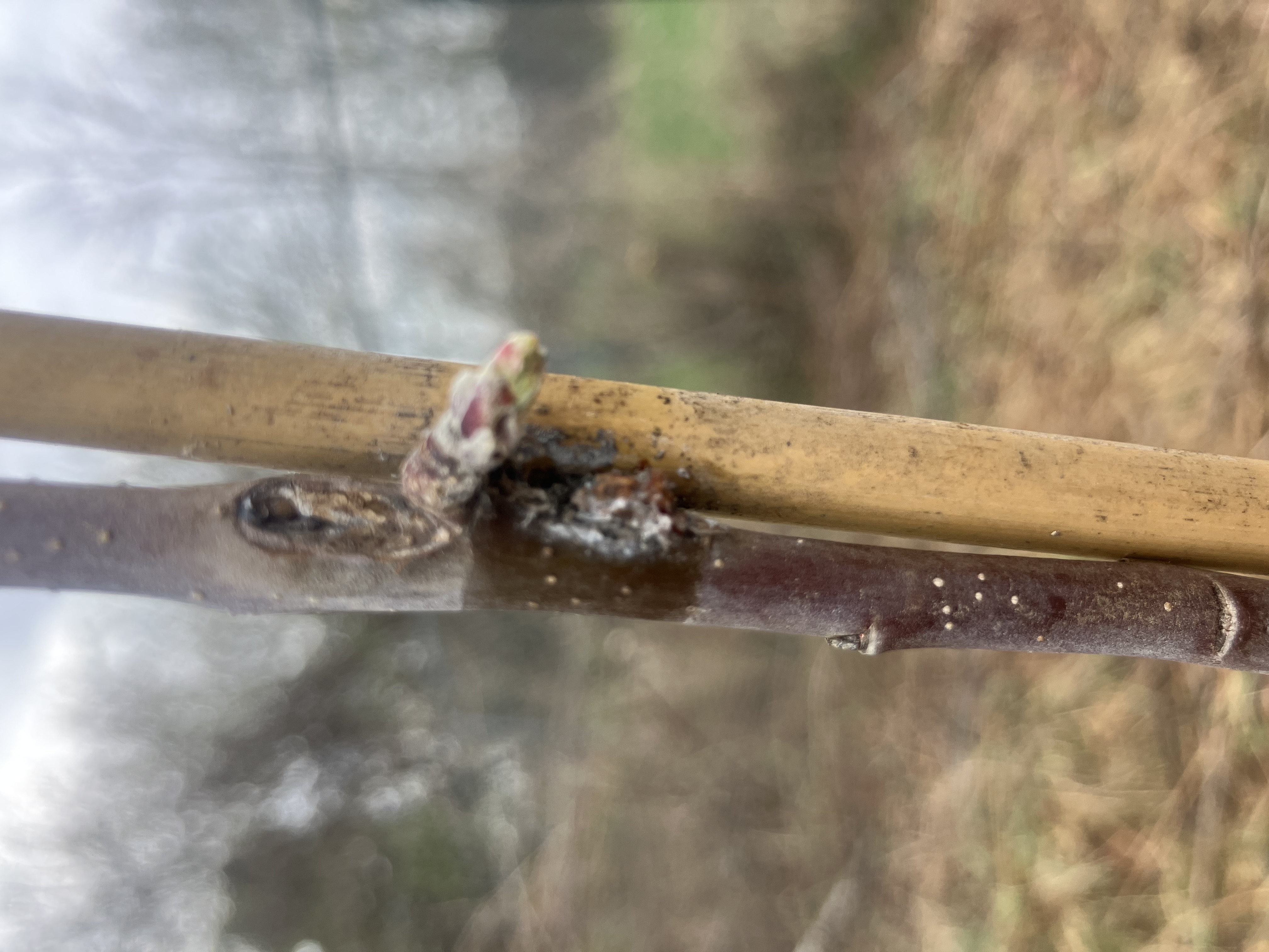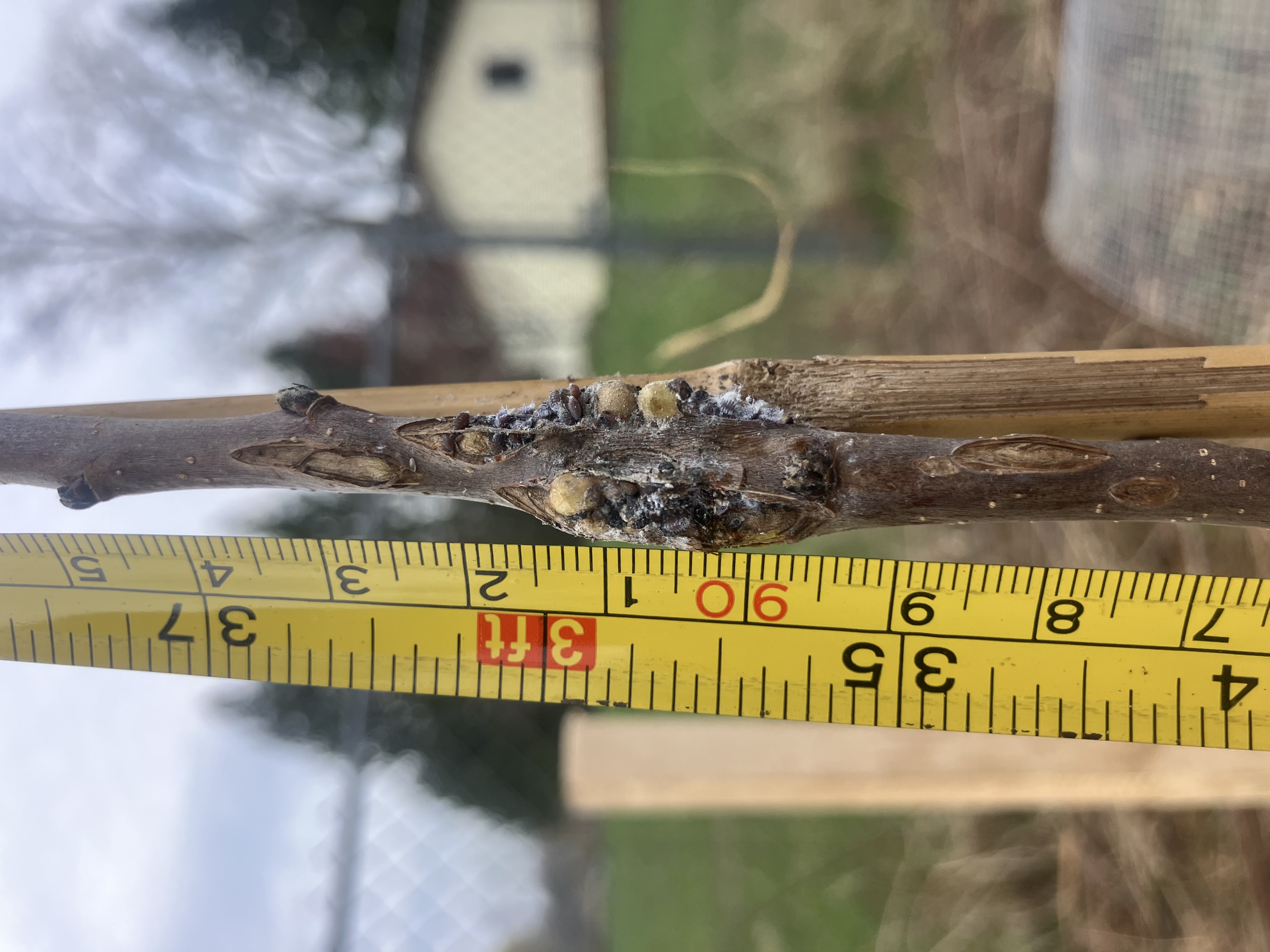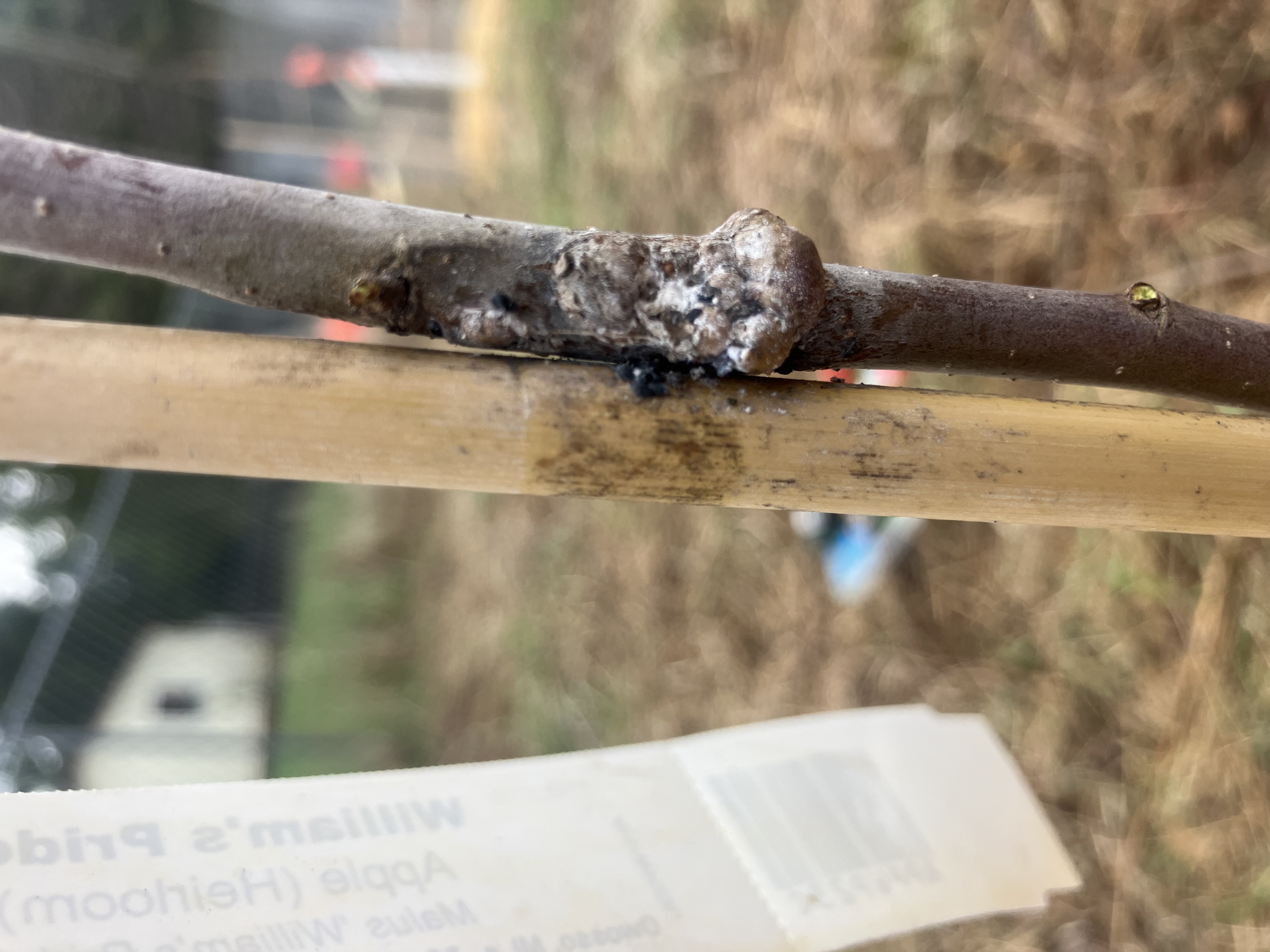On Sunday when I went out to prune and check everything out further, I removed most of the tape holding the trees to their bamboo stakes to give them more airflow. Under several sections of tape on both trees, I saw spots that reverse image search told me were woolly aphids, and that seems about right. The reading I’m doing says I have options for treatment, but I’m worried that the infestation has been damaging enough it may have already affected the roots, and may prevent them from becoming established. I also am not sure if I could cut all affected portions off as they are as low as ~24in. I am also worried that they will spread to the other trees I’ve planted. I say all this as someone who is brand new to fruit trees though.