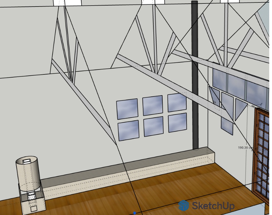 We can frame the rest of the wall over the cobb mass. If it’s at all possible to keep the weight under 1 ton and still have enough mass to have safe temperatures on the outer surface of the cobb to the touch. The maximum space I think I can work with in this location of the building is 9.5ft along the length of the bedroom wall and 3ft along the exterior wall until it comes close up to the exterior door. The stair landing would be built over that corner near the exterior door. The exhaust pipe either needs to go up through the roof, or if I can squeeze in a third row of exhaust, it could go out the side of the building. The eves extend 2ft out from the wall. With only two rows of exhaust, that only leaves about 18ft of pipe.