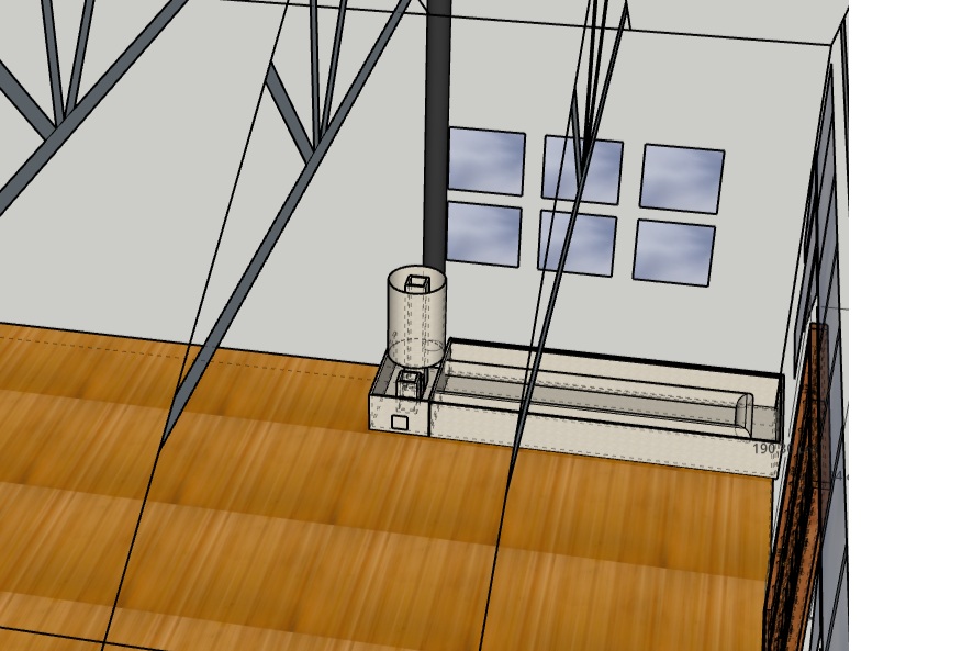 For this build it seems it has enough challenges that I’m thinking a conservative 6” design, J bend, Cobb mass, with an exhaust pipe going straight up through the roof. Unfortunately I don’t see a way to put the exhaust pipe up through the gap in the roof ridge, since the bedroom door is right in the center.