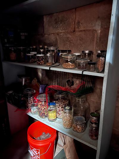 We have the obligatory "Fraidy-hole" storm shelter here in Oklahoma, for when rotary weather stops being a spectator sport and gets serious. We squeezed a little more out of the budget and bought what amounts to an oversized unit for two people and a dog. It's nominally rated for "12 People," though I would want the other 11 to be very good friends. It's big enough for a set of shelves and a stack of milk crates for cabbage and potatoes, and a few apples. So, I guess we're "stacking functions."
