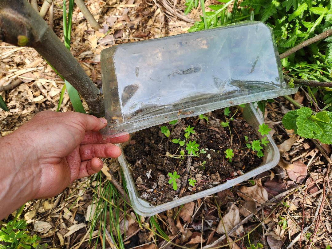 I love lupines and I wanted to grow some for my yard, but also for some school gardens that I volunteer at. I had read that growing them in a take out food container was a good way to let them grow up enough to more likely survive and stop animals from eating them while tiny. I started in a regular take out food container, but it was small and they outgrew it quickly. Then I moved them to these large plastic salad boxes that we get from eating so many green salads. I drilled 3 holes in one side of each box, so I could use the second container as a flip up top. I wove a string through and tied it. The plants are protected but they can grow up to be pretty big before I plant them out. Of course I stabbed a slit in the bottom for drainage and in the top so a bit of rain can come in. They maintain moderate moisture this way. I have been planting some out and so far about half have survived. I'll keep gradually planting more out to see if they'll make it. It seems so much cheaper than buying a full plant.