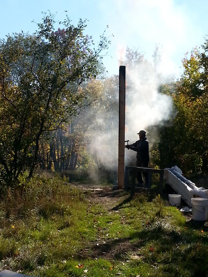 Bill Bradbury wrote:I absolutely LOVE this treatment, but I char the wood after assembly. I use locally harvested Douglas Fir that has only aged a few months, so it still has some moisture to it(20% or so). Then I use a propane weed burner that has a control valve to char the entire structure. I then sand lightly and stain with Penofin rosewood oil. I have attached a photo of the pergola and greenhouse I built last summer on the back of my house.