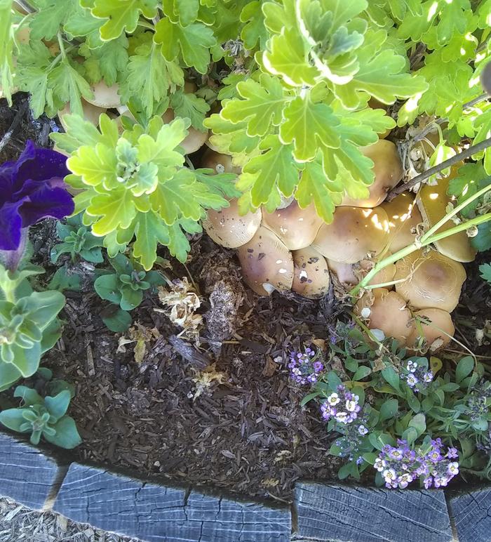 What are the mushrooms with the chrysanthemum and petunia?