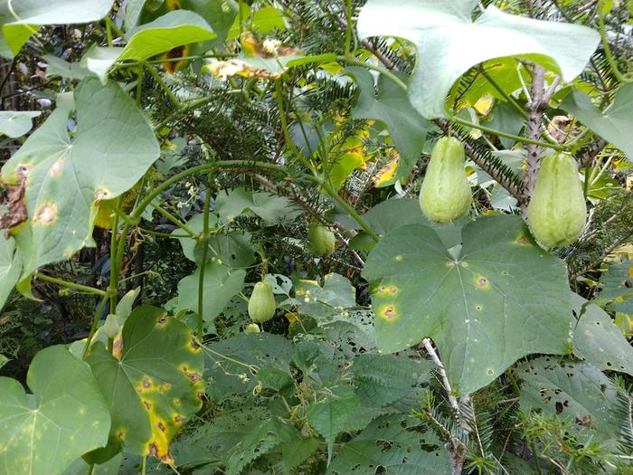 Chayote vines are producing despite disease. I'm harvesting them early this year so that they're easier to cook with. I'm sure I'll miss enough of them that cure on the vines for using later anyway.