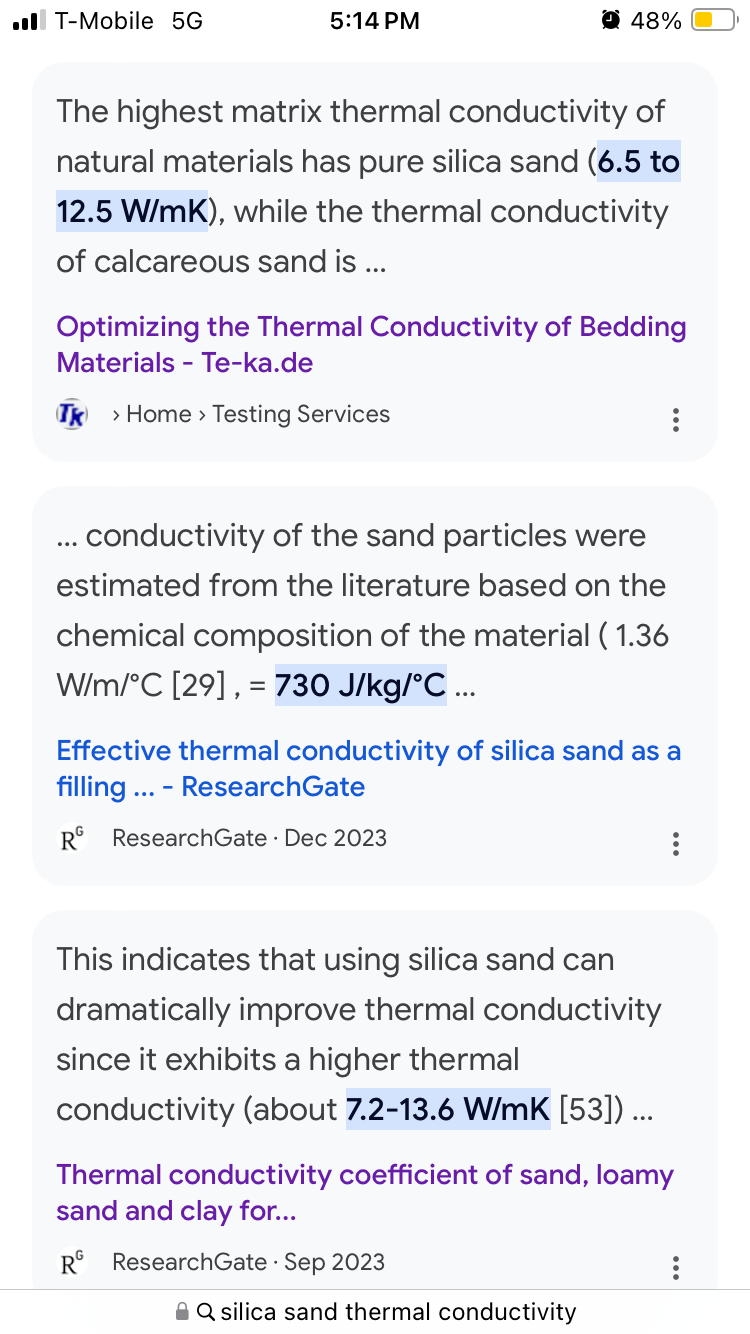 Yeah I have been gathering all sorts of data from multiple sources on the storage of heat in thermal mass. I have dumped many of those links in this thread. All kinds of of options on this have sort of stymied my progress as each new video I watch on thermal storage unlocks even more ways we can use thermal storage.