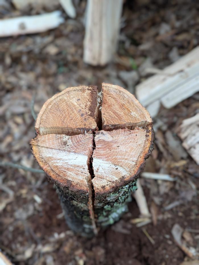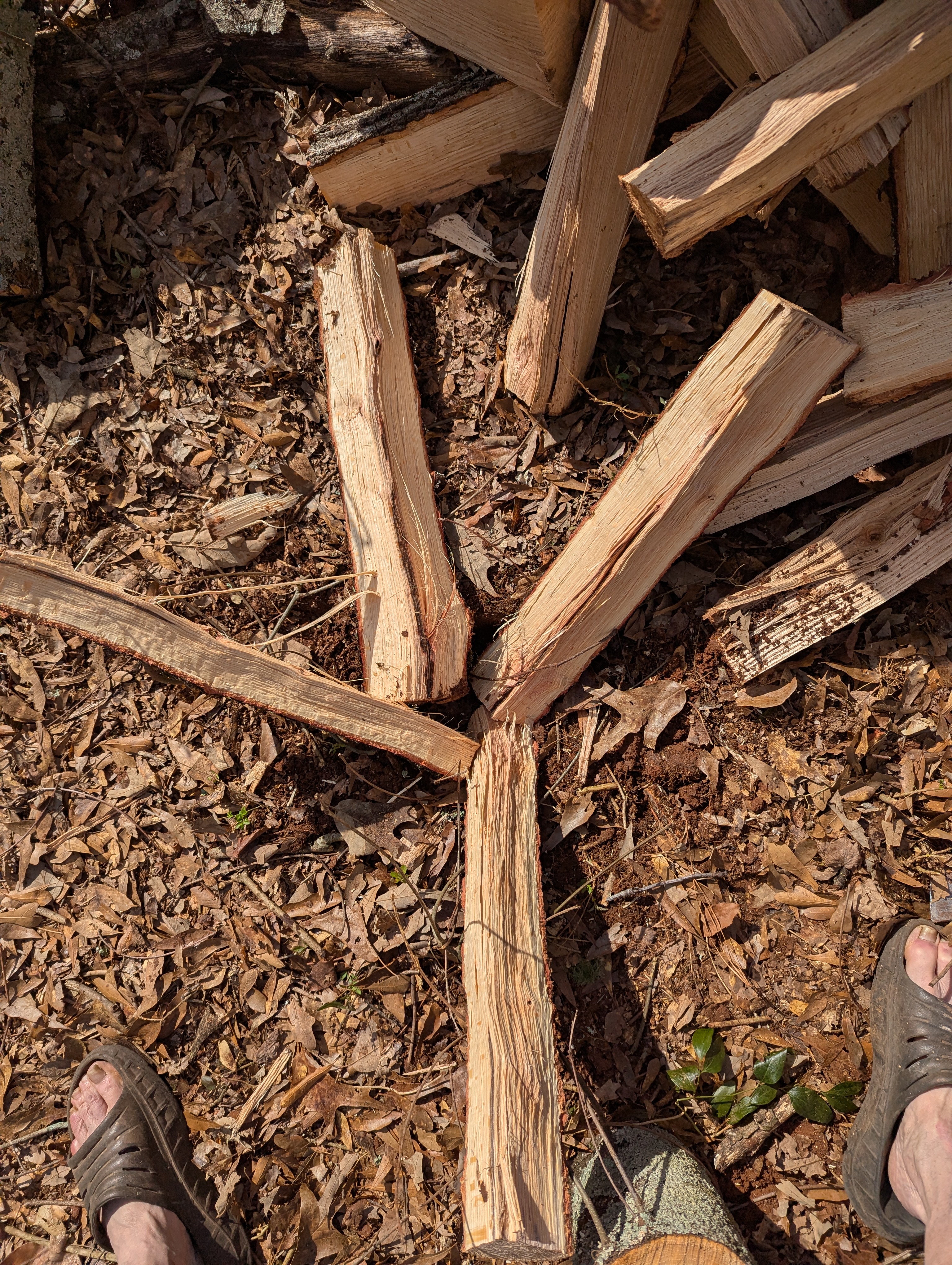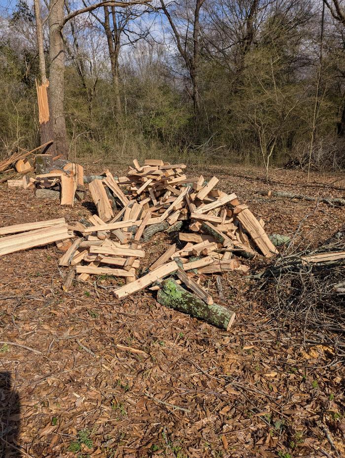 Just came in after some vigorous cutting and splitting. Photo from new work in our eastern acreage, as splitting ash wood followed by water oak and the past two days a lovely small red oak. All these trees would have potentially caused damage to our barn. Had to use mauls plus sledgehammer/wedges on the knotty twisty ash, but this red oak has been a gift from God