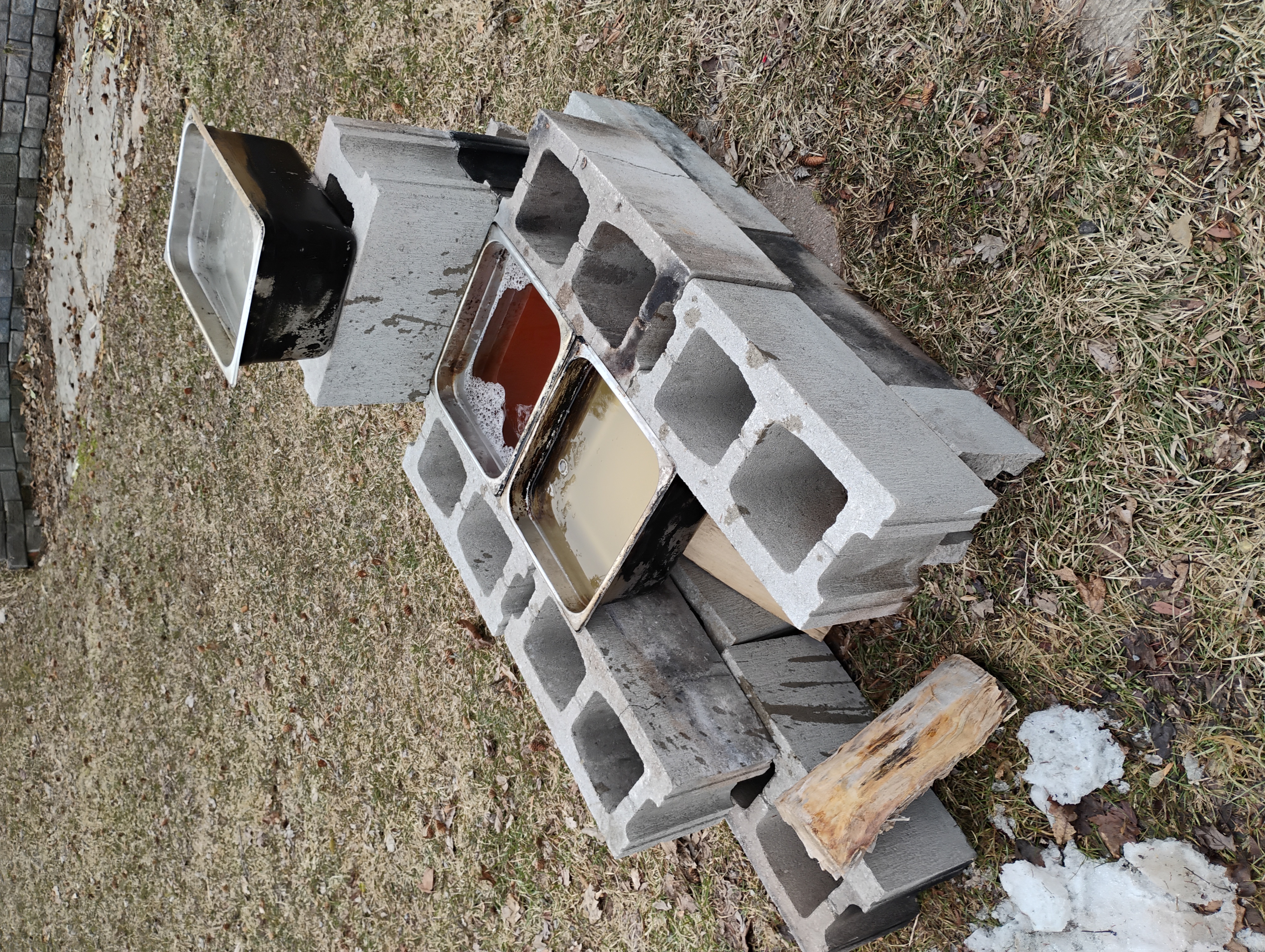 This was pared down from last year due to a bunch of my cinder blocks breaking, and me being too cheap to buy more with how short the season ended up (I boil on electricity in my garage if my trees produce less than 15L/day).  Last year it was more of a j tube rocket design and definitely boiled faster.