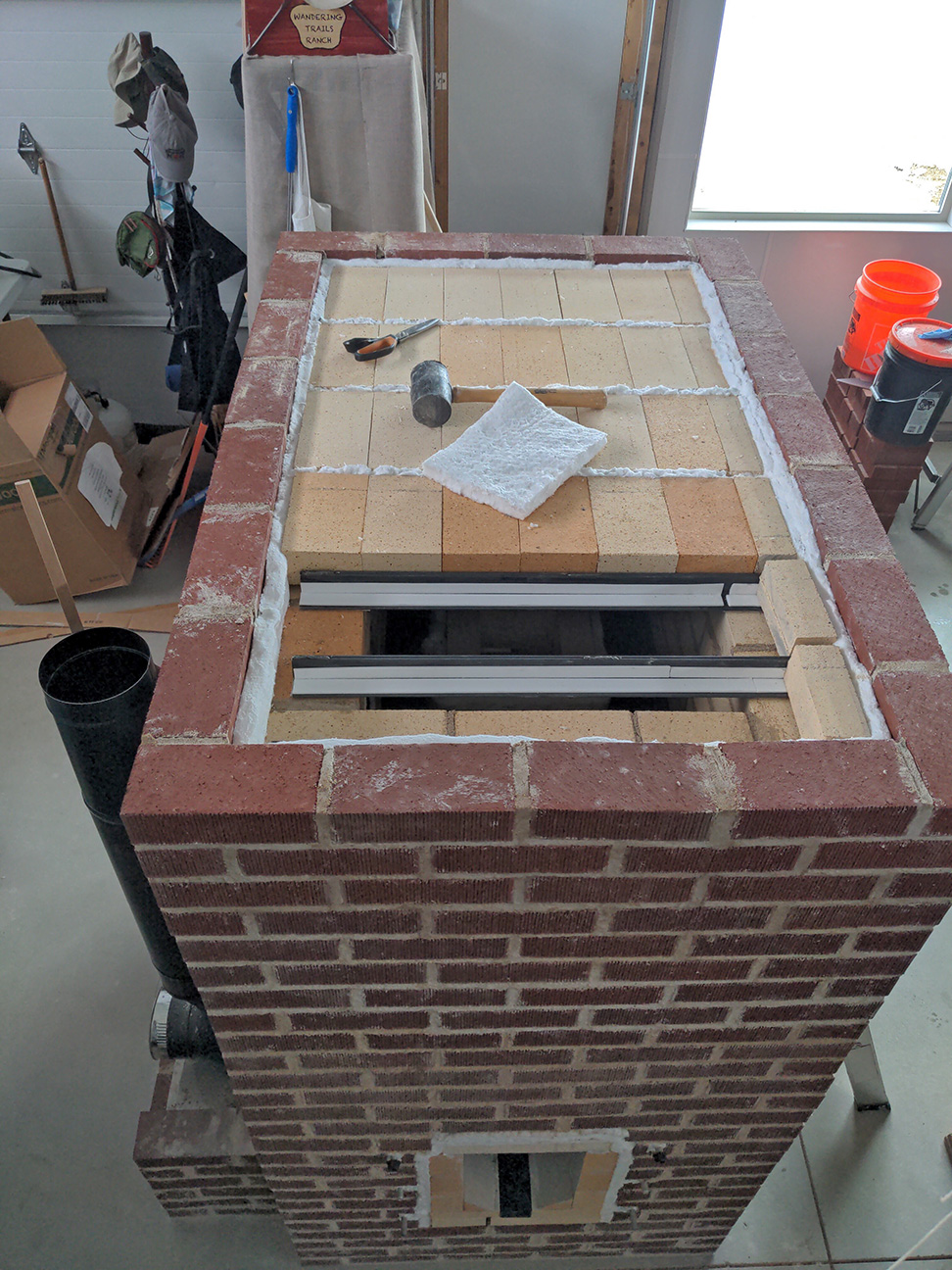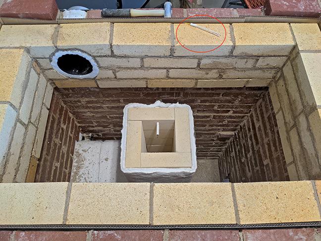 Connecting the chimney will be completed today and laying in the outer skin brick for the roof. Meanwhile, Mrs Rocket Boss is busy with a bristle brush cleaning up all of my mortar mess on the brick. A thankless job and very much appreciated, especially considering my early learning phase of masonry work.