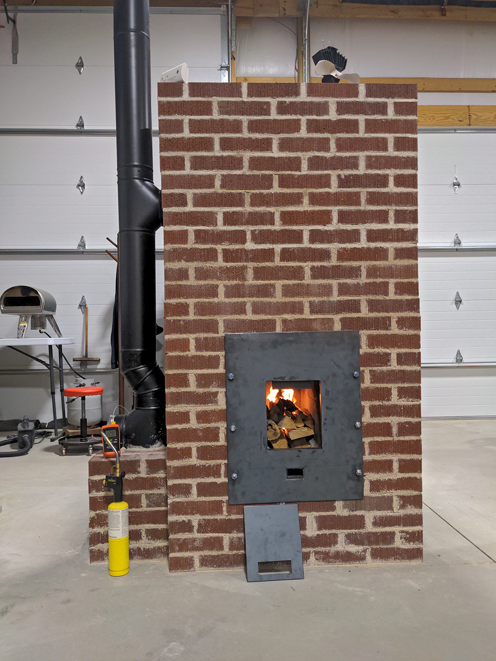 Loaded up the firebox about 3/4 and with the help of my plumbers torch, the dragon took flight! As of this morning I'm now on my 4th burn. With the bypass open and the door off it lights right off. After about 10-15 minutes I close the bypass, place the door and sit back and listen to the low roar and watch the pyrometer temperature in the top of the riser as it goes up. The max riser temps have been around 1,200 deg. By the end of the burn the thermocouple in the ref brick of the inner skin is around 250 deg. Around 2 hours after the burn the outer skin is around 90 deg. Chimney pipe exit temps right where it connects to the exhaust port at the base of the heater has run only around 110 deg but I'm getting a good draft and no visible smoke or steam outside. I expect the chimney exit temps will be higher once I'm doing full load burns.