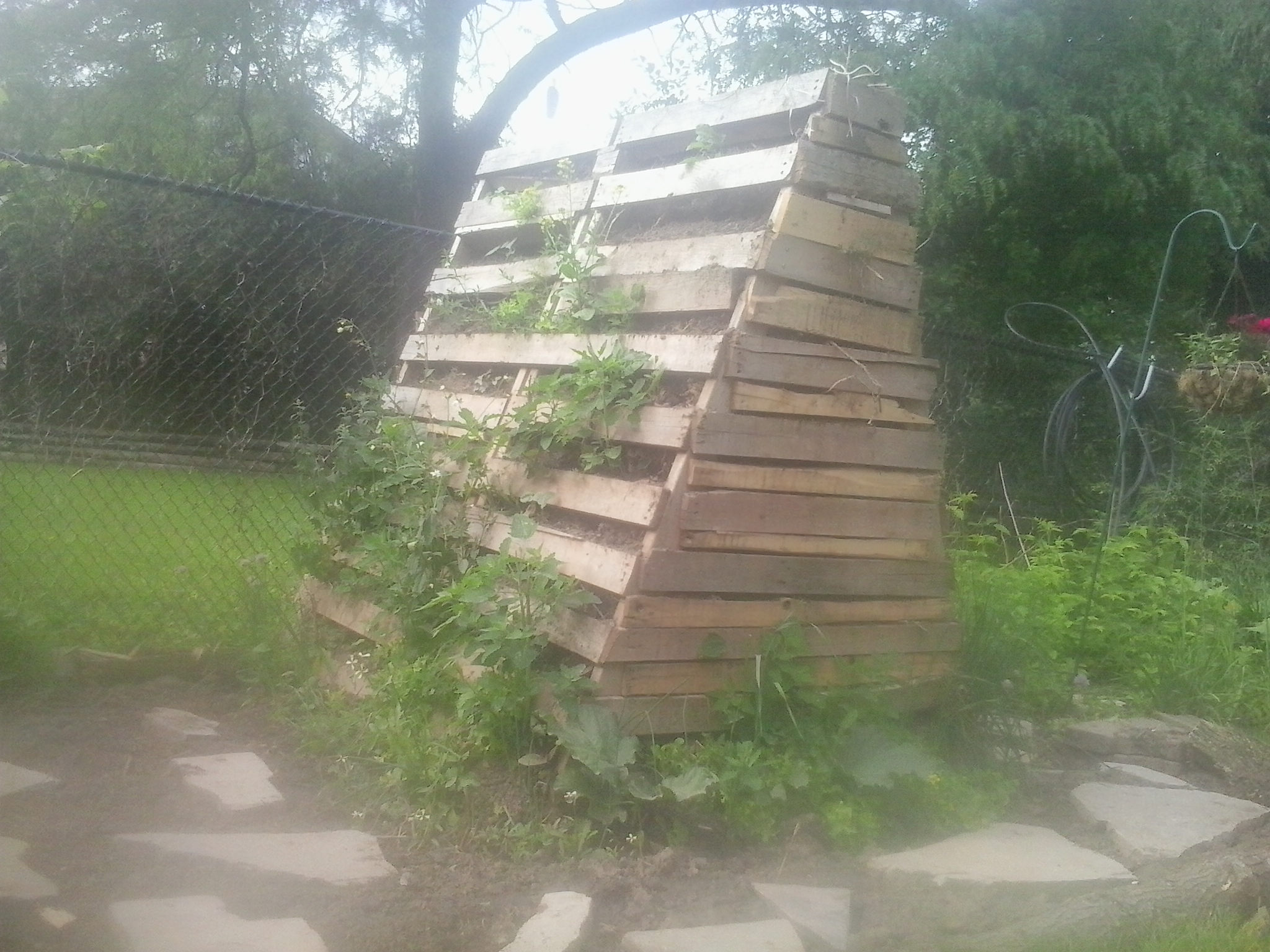 .....The rain has a hard time getting into the mound and it is also difficult to water, I used far too much wood so the soil is still not fully settled after 2 seasons....I wanted garden beds that I didn't need to water more then a couple of times a season but also vertical. If you follow my other posts you will know I tried a thin vertical wall and also a wicking style raised bed, but this one is by far my favorite. I call it "the garden cube". It is basically a hugelkultur mound inside of a big liquid shipping container with the sides molded so that I can plant in all 4 sides plus the top. The rotting wood will give it fertility without digging and you can top up with