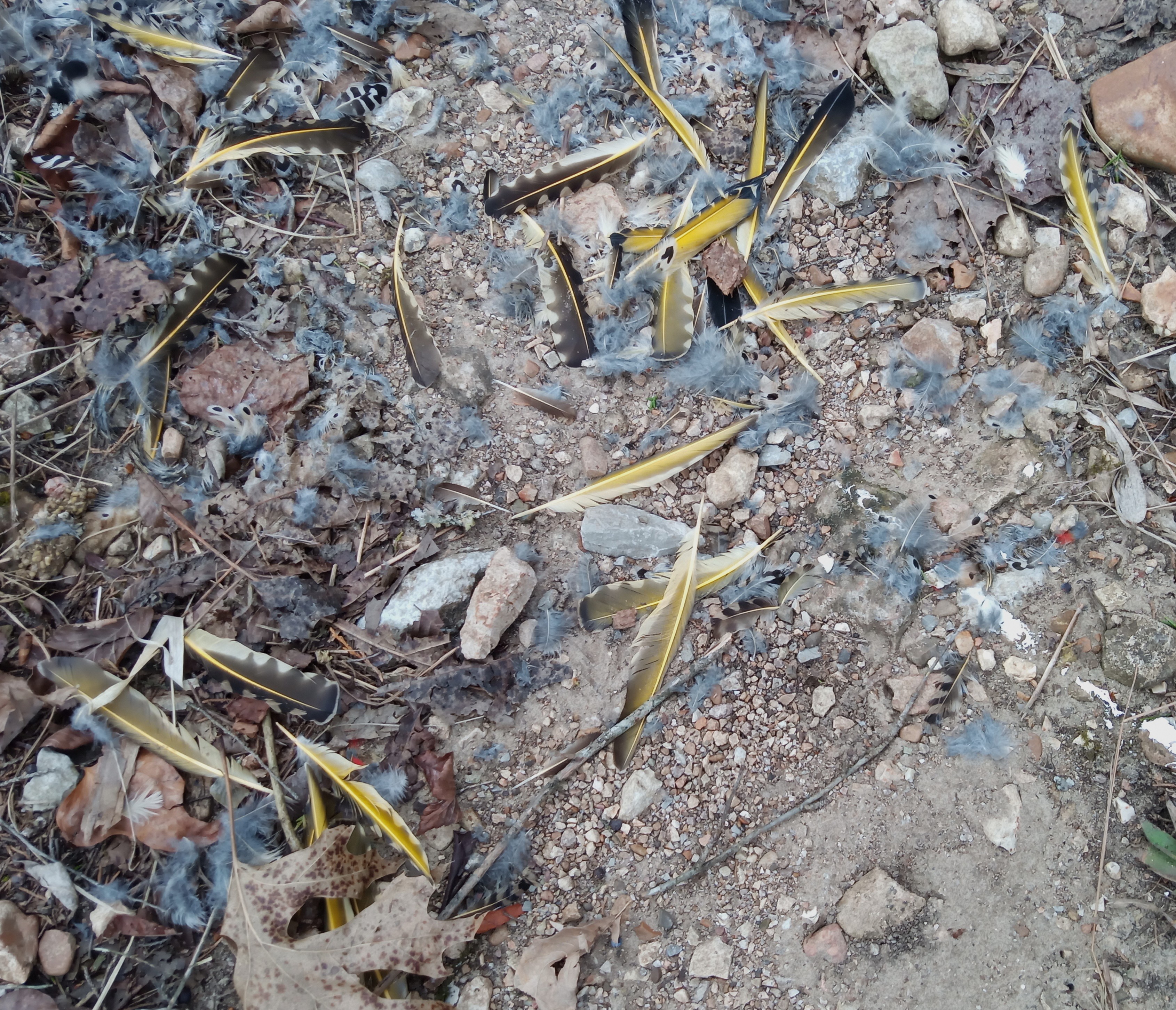 the feathers we think were from a yellow shafted flicker, look close for bits of red.