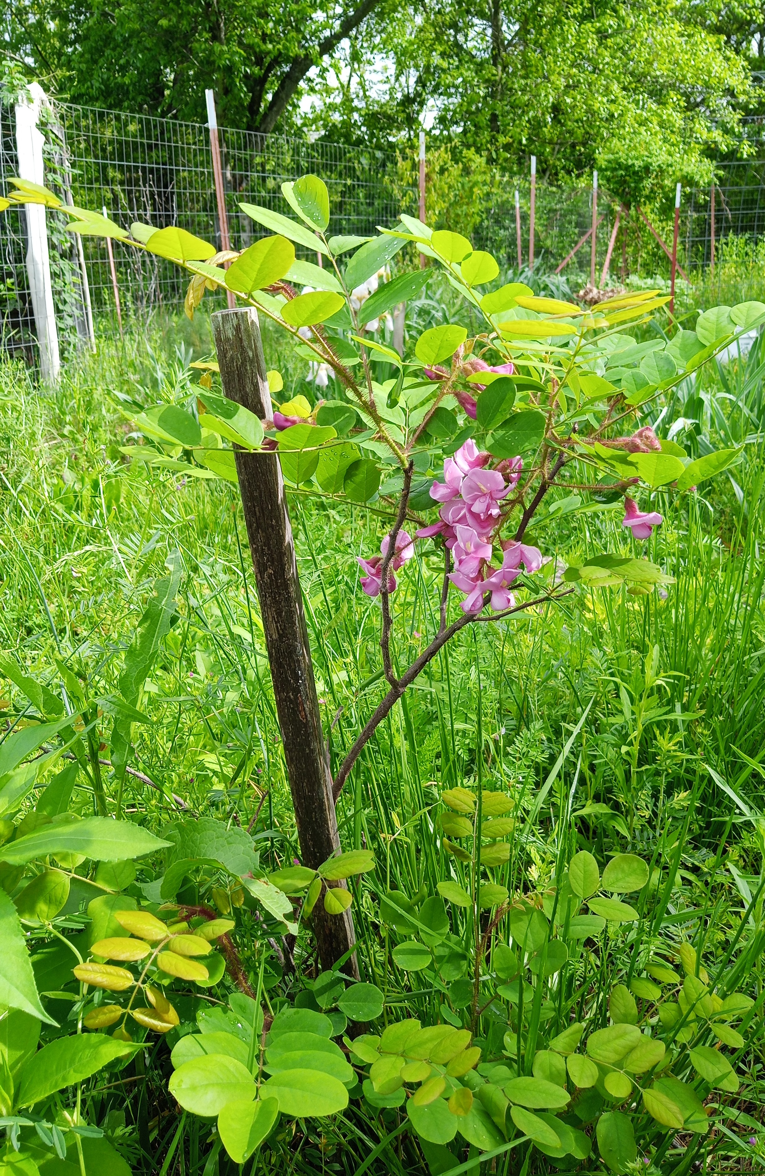 The bristly locust tree is a large flowering shrub with compound leaves, pink pea-like scented flowers, and reddish-brown seed pods. Its fast-growing nature and intricate root system mean that the bristly locust shrubby tree is considered invasive in many states.