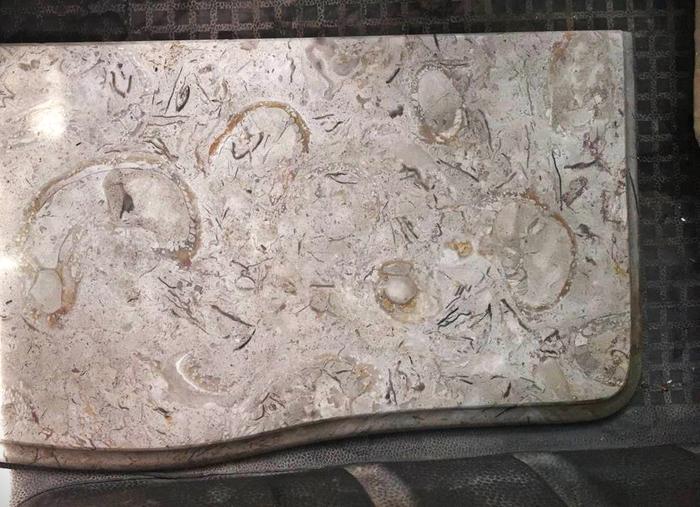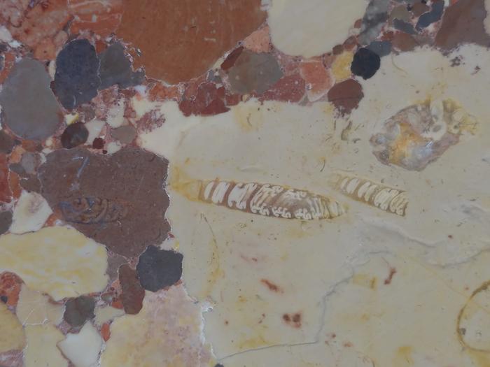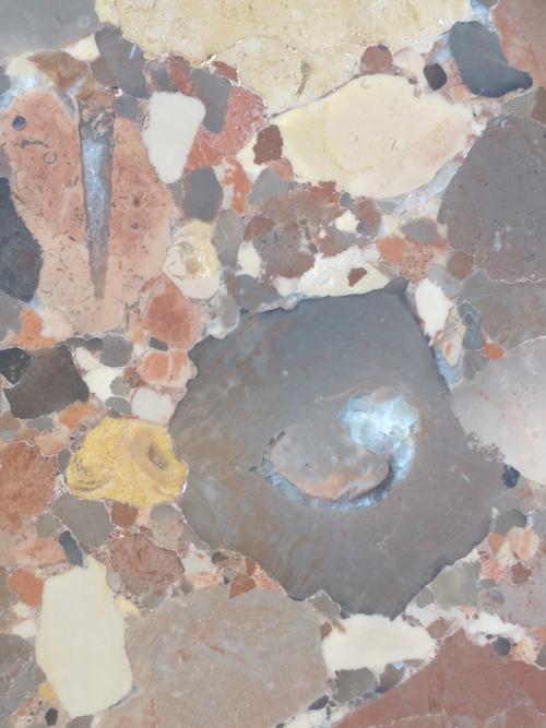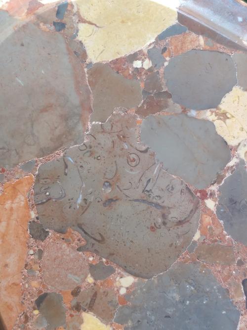 breccia from Arrábida. Breccia is made up of fragments of all sorts of rocks that have become cemented together over time. Like rubble that formed during an earthquake and all flowed together then sat around for hundreds and thousands, maybe even millions, of years until it all congealed back into rock. The result is that a shelf made out of a piece is like having a whole rock collection in one piece.