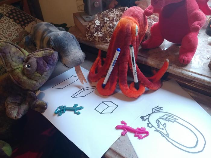 A few days later, after Christmas was over and we were all getting ready for the new year and thinking about what we'd learned over the previous one, Spot and Iggy were trying to draw some three dimensional shapes and figure out the mathematics behind them. When all of a sudden the pens were snatched out of their hand by Somebody New who appeared to be trying to communicate with them.