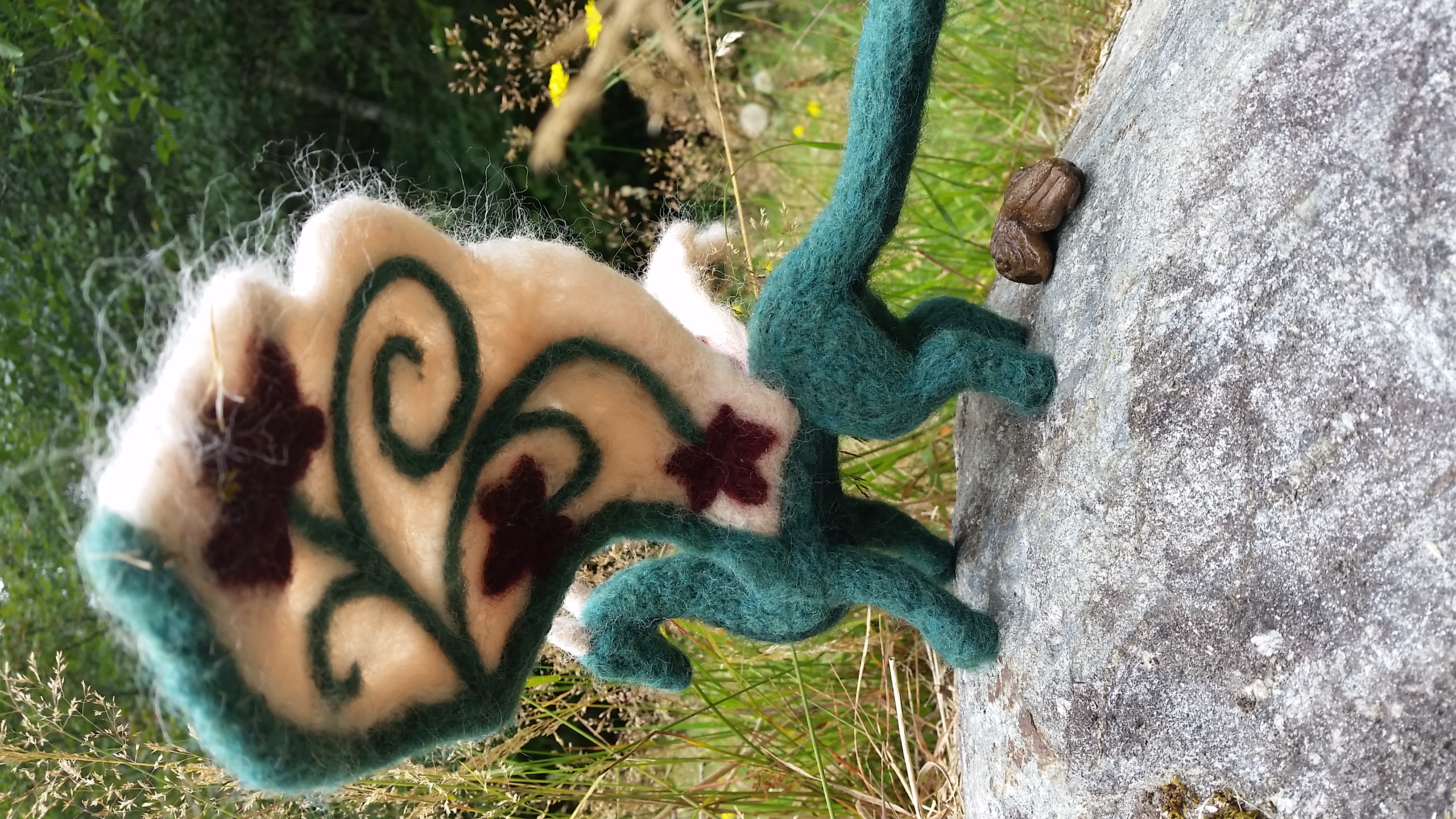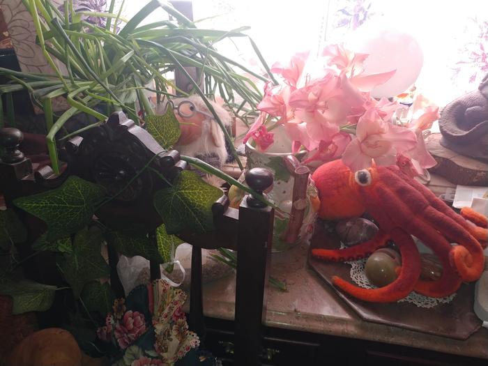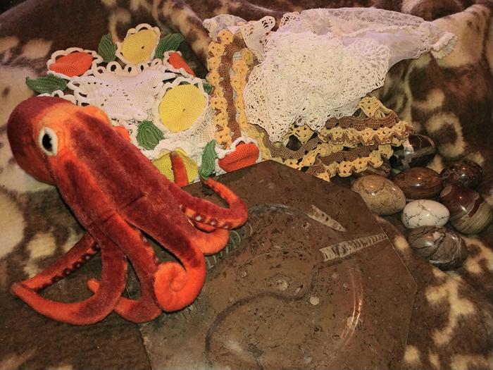 So we tried all the doilies until we found one that just right and Squiggles began to arrange the nine eggs on the eight-sided plate, very carefully and precisely, and seemed to be counting and double and triple checking the positions as he did so. Then he climbed up onto them and sat on top of them, like a broody hen on her nest, and I put the whole nest safe on one of my cupboards. Which at the time still had a wooden top but as I write this I feel compelled to admit that it now has a lovely fiery red bit of stone that appeared a few weeks ago, but that's not really relevant to this story and wasn't there when I took the photos.