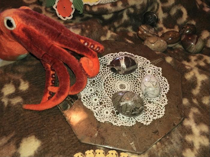 Squiggles looked sheepish, then reached out and touched my collection of stone eggs that he'd also found somewhere. There were nine of them.