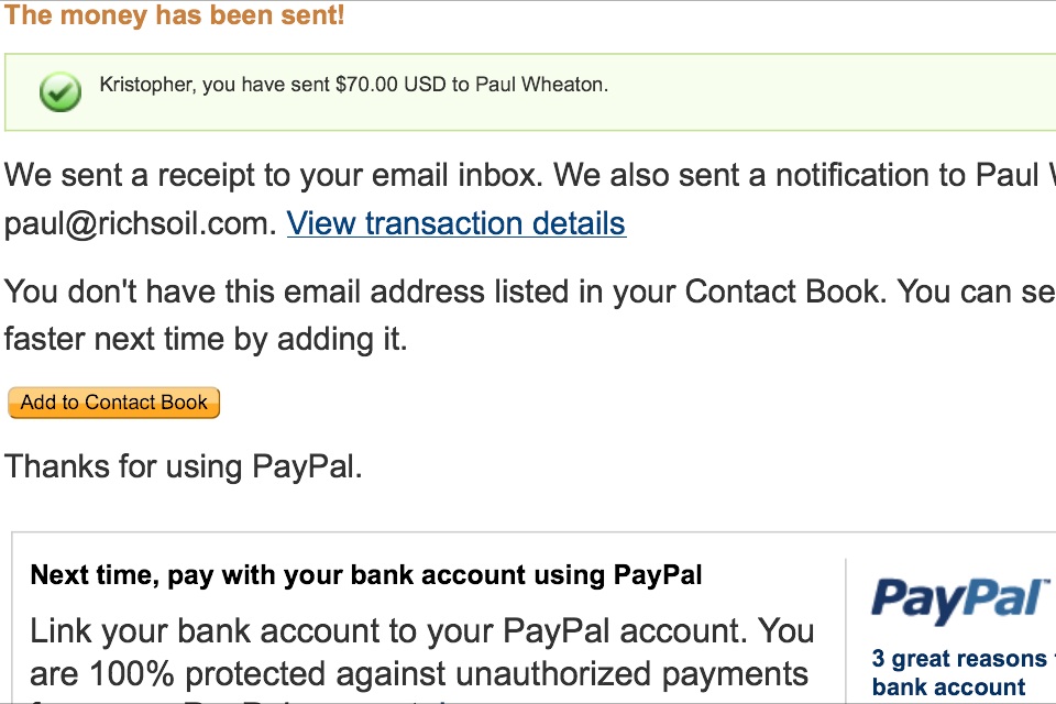 paul wheaton wrote:Please send $60 via paypal to paul at richsoil.com. Make sure that your paypal address is set right - cuz that's the address I plan on using.