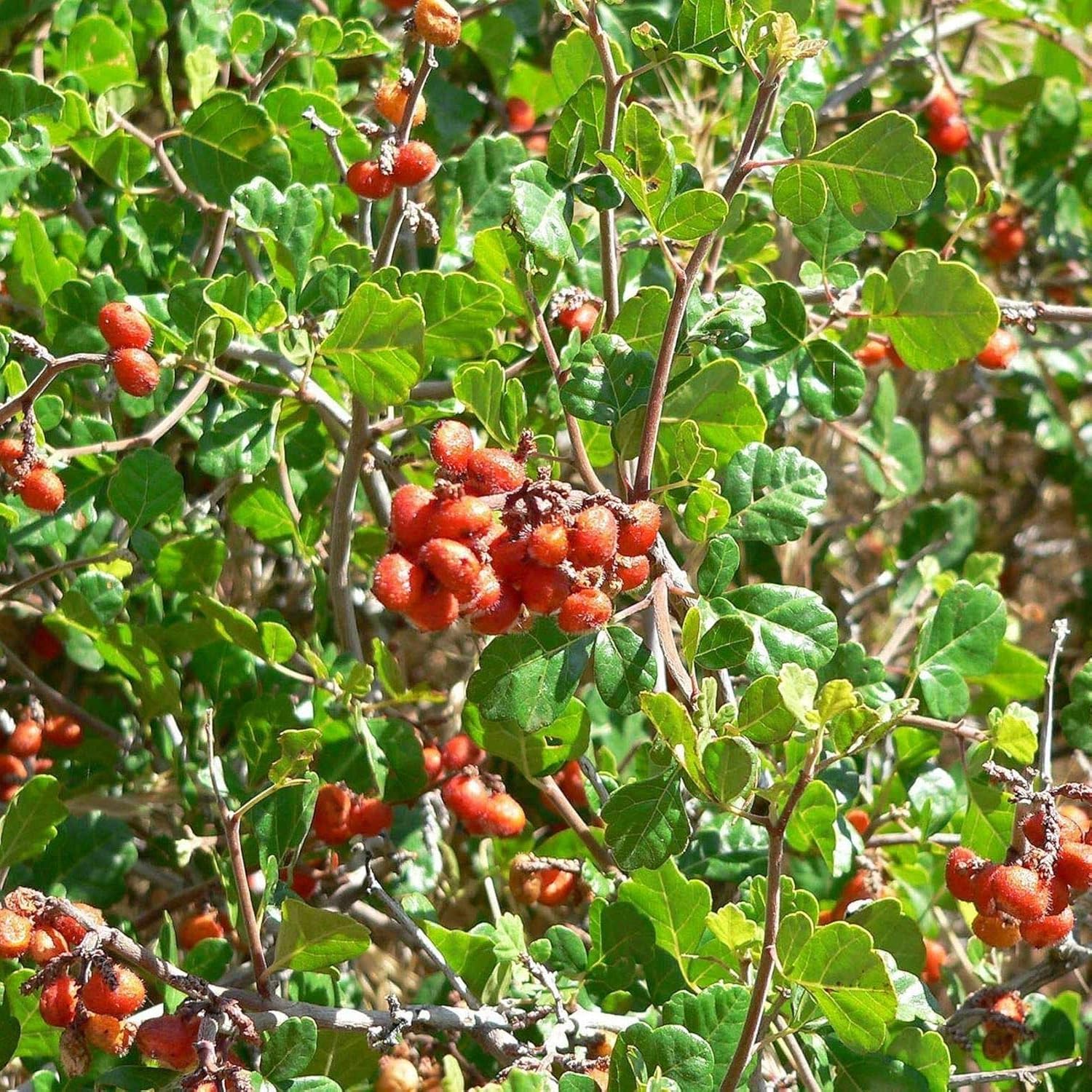 The fruits (drupes) of Rhus coriaria are ground into a reddish-purple powder used as a spice in Middle Eastern cuisine to add a tart, lemony taste to salads or meat