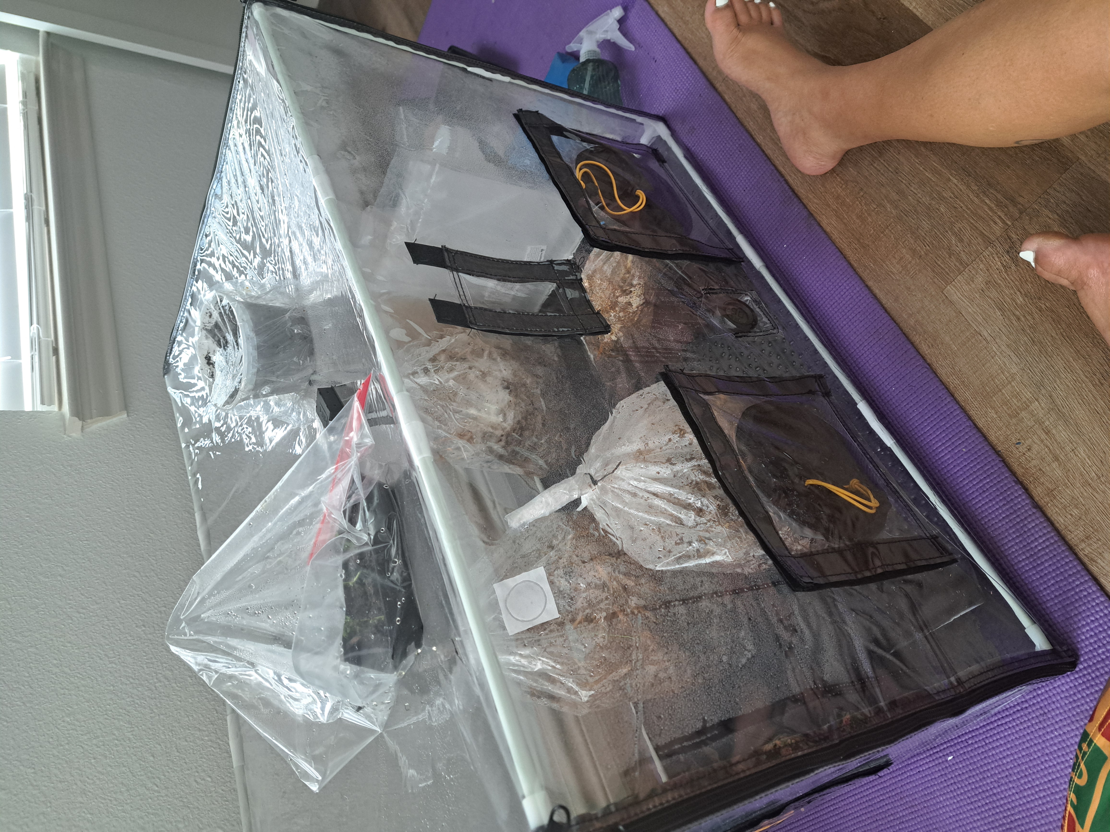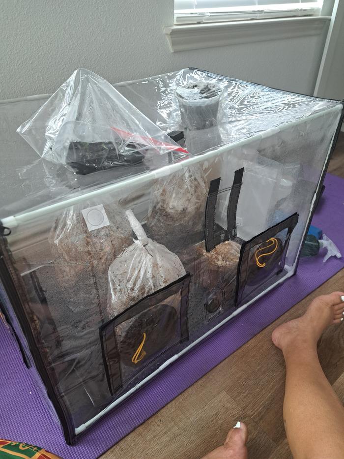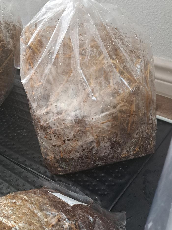 Hi guys so this is my first time growing I've made inoculation bags out of coconut core and straw and I had bought a pre inoculated bag of grain which I split up into my substrate to which I also added vermiculture warm casings anyhow I have liquid spawn called out girl but I don't know how to use that yet and my bags aren't very tight but they are immaculating just not completely I've had them about a month inside the humidity tent not sure if I should cut into them or wait for further inoculation