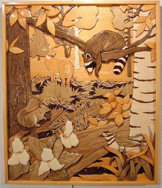 Intarsia is a form of woodworking which fits coped pieces to form the piece. Colors are handled with different species, but can be polished, stained and painted. The basic tools for this artform is a coping saw, some files, and chisels.