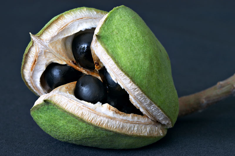 It is a large shrub or small tree growing to 8 m tall. The fruit is an oval leathery capsule 5–6 cm diameter, which splits into three sections at maturity to release the 6–18 seeds; the seeds are black, 1.5 cm diameter, resembling a small horse chestnut seed.