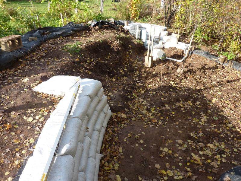 Late in fall, I quick pulled my earth bag tools back out and made a few little retaining walls inside the foundation, distinguishing my two interior levels.