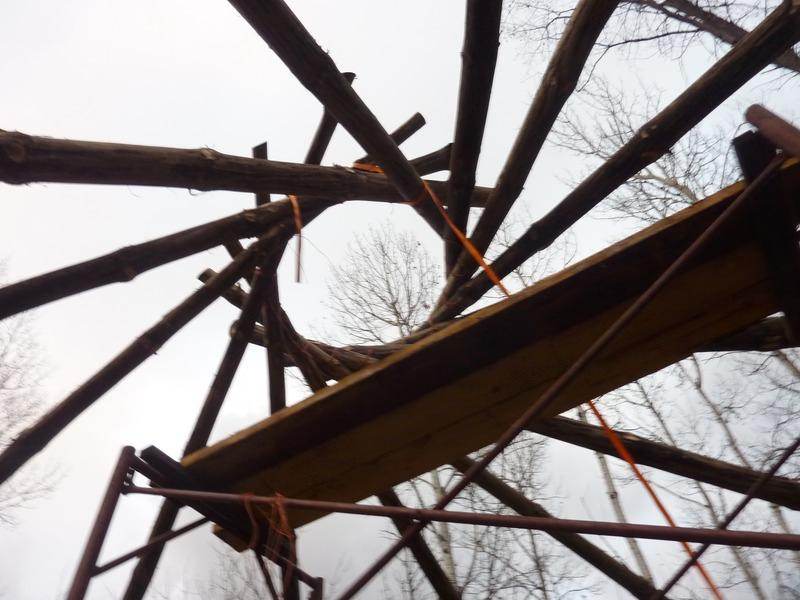 Then, on a cold rainy day in fall, I dragged my brother out there to help me (okay fine, I was helping him!) put up the rafters in the reciprocal frame design.