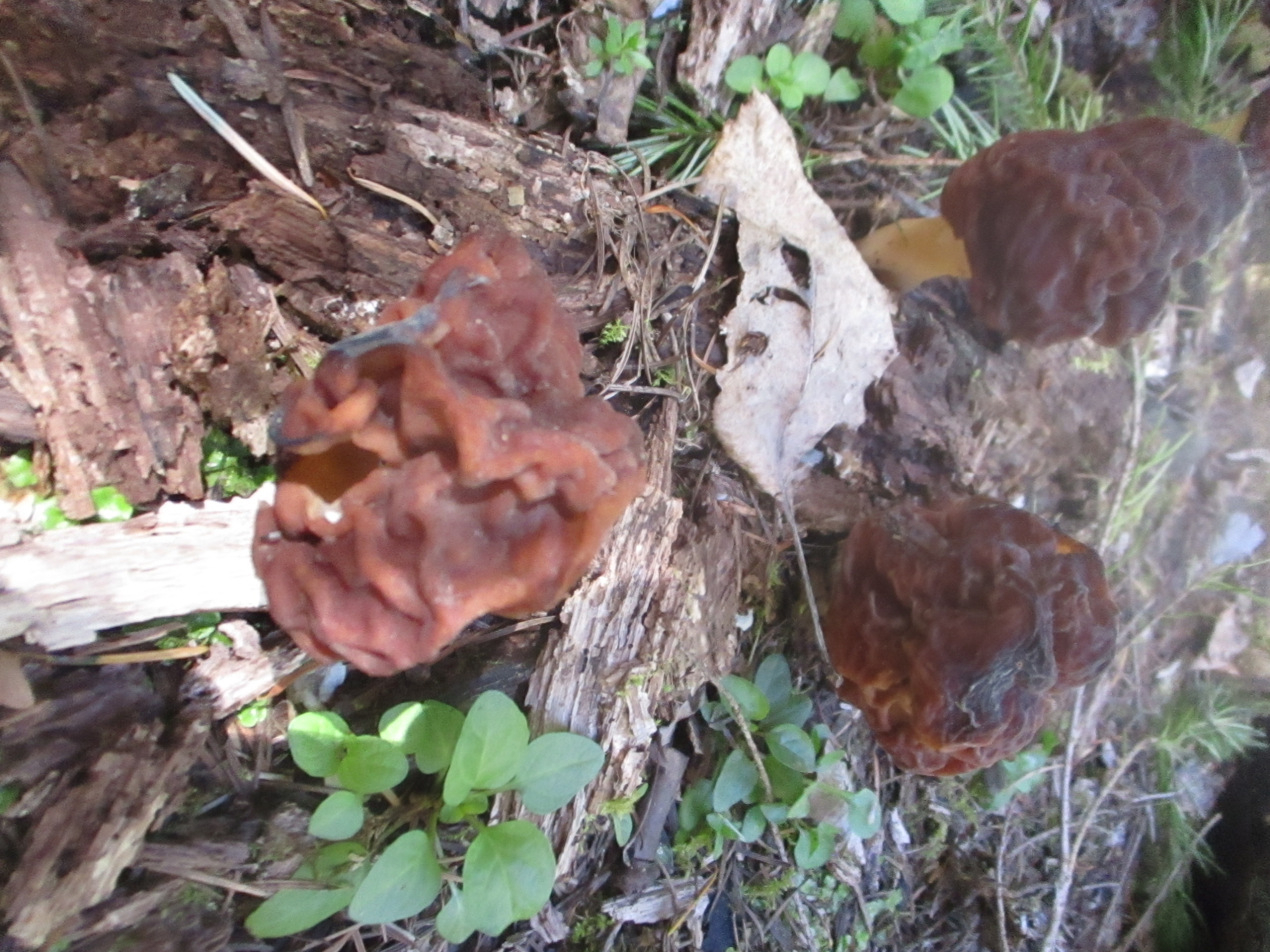 False morels (Gyromitra spp.) are common in my food forest this time of year. (Too common!!) Although some people eat them after parboiling, they are still poisonous and eating them can even lead to a rather unpleasant death. Evidently, they contain a compound similar to rocket fuel!