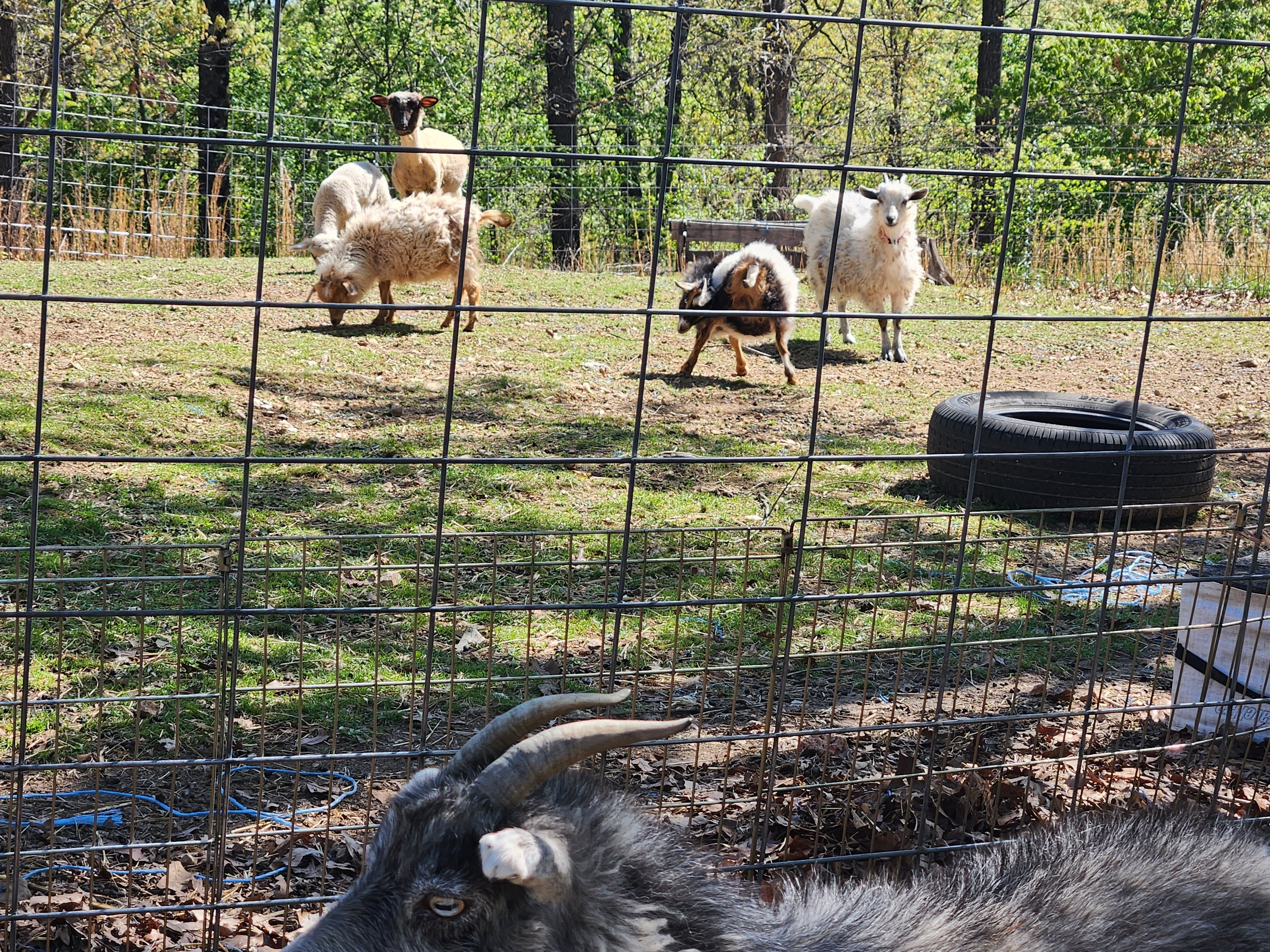 Chickens: ISA Brown, Auracana, Buff Orpington, Leghorn, and a few bantams of breeds I can't remember.