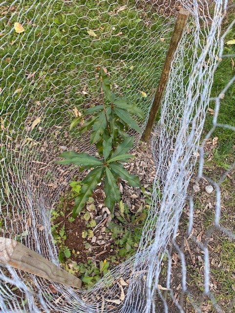 Commercial tree guards are quite pricey, so I cut 3 foot gutter covers in half and then use wires to secure three of them together into a triangular tube as shown below.