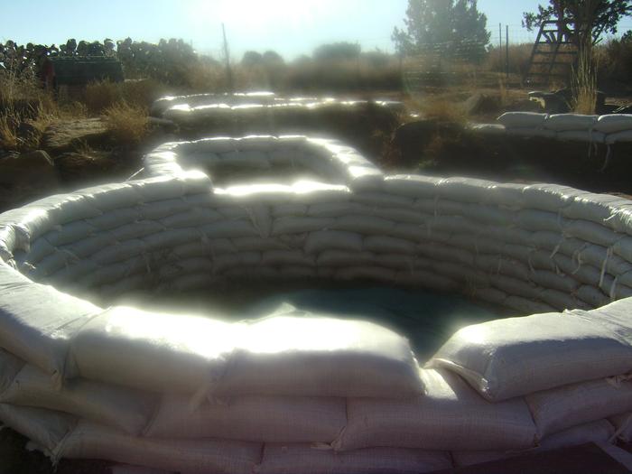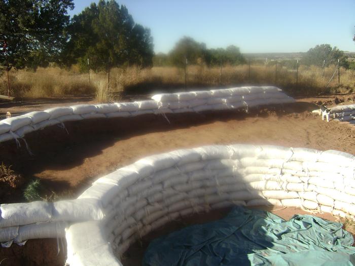 so the dirt toward the 2 levels of bags will be a part of the pool, we will coat it with mud, then stucco it, then pool plaster, then paint it so no to pvc liners. it will also have a 10 foot tall water fall and slide attached. there is a grotto located just behind the pool structure, that has not been built just outlined. also this roof top will hold our pool hot water solar collectors. to keep the pool warm, the basic conscept would be to have just over the sqaure footage of the pool 10' round 4 feet deep be heated with the pool heater and the conjoined shawlow pool full of aquatic plants and fish. the water fall would provide some soothing sound and air to the water.
