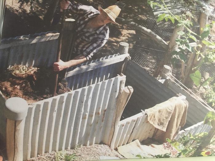 compost bays uses the natural slope of the block to make compost turning easy. When the top bay (at house level) gets full, Joel moves the divider between bays, and rakes the compost into the next bay down with the assistance of gravity, turning and aerating the material. At each turn microbial action makes the compost heat up, resulting in a rich and well composted mix at the bottom for the nearby orchard and garden."