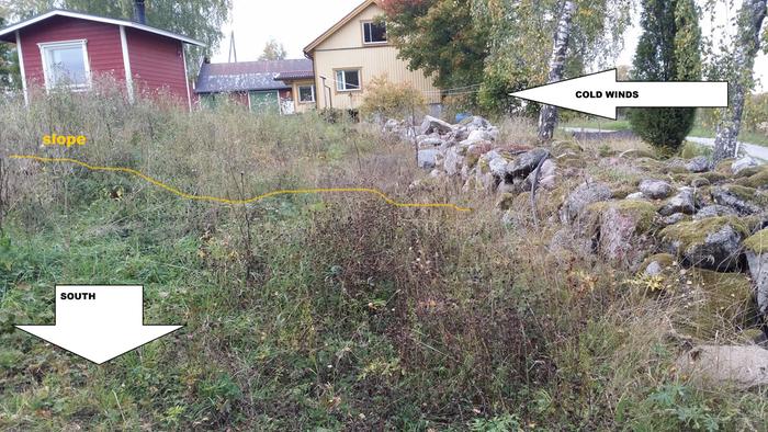 ), If I turned right I could see the first picture scene, the field. There is this old stone row that used to block cows, but now it just remains there. I was thinking that maybe there could be planted a row of....something, right next to the stones, since most likely they collect the heat of the day. Then again, it blows coldly from the field, so that might be a problem. It is on the downside of a slope, so most likely it's more wet than dry. No standing water though, I haven't seen that ever.