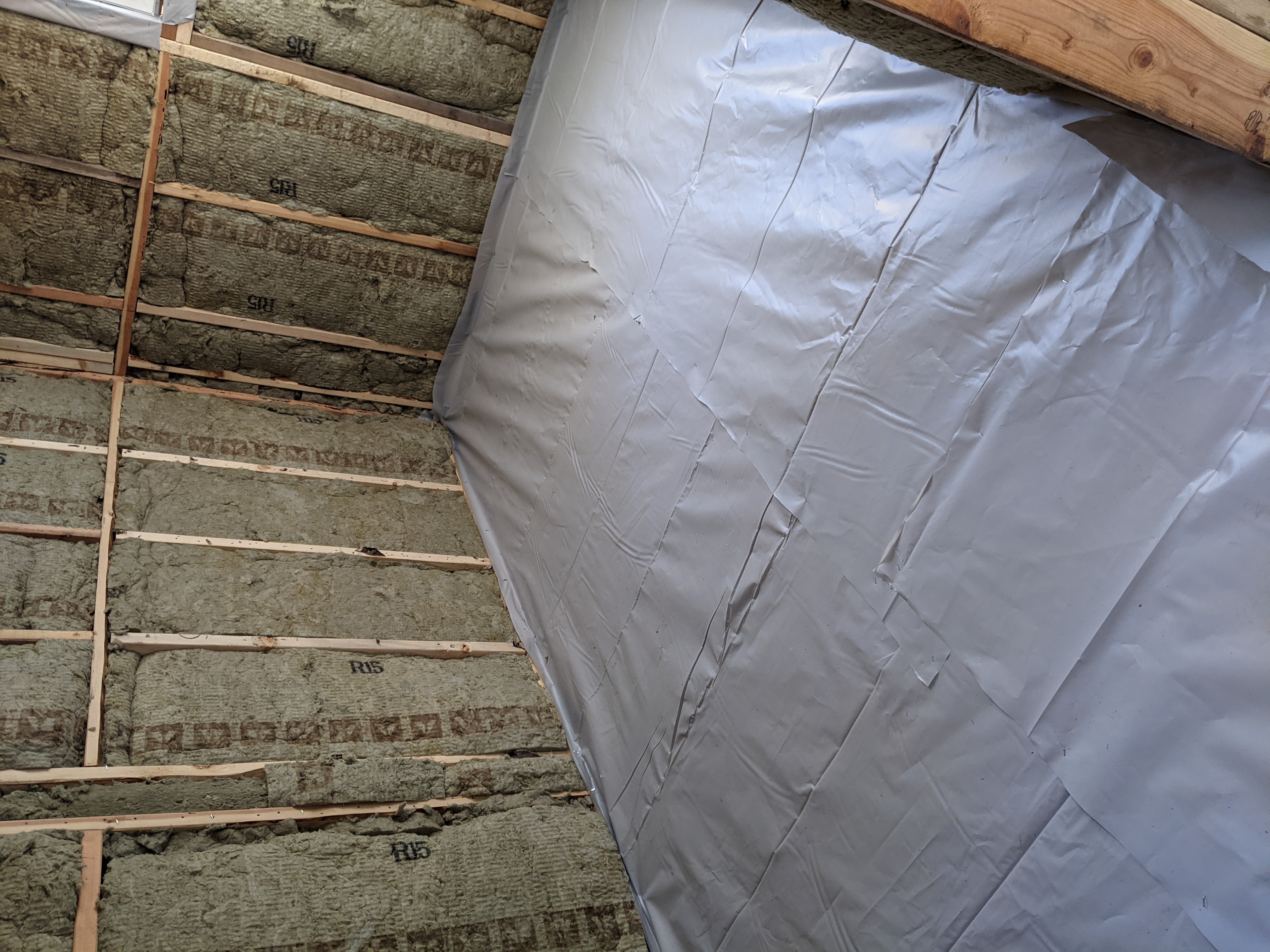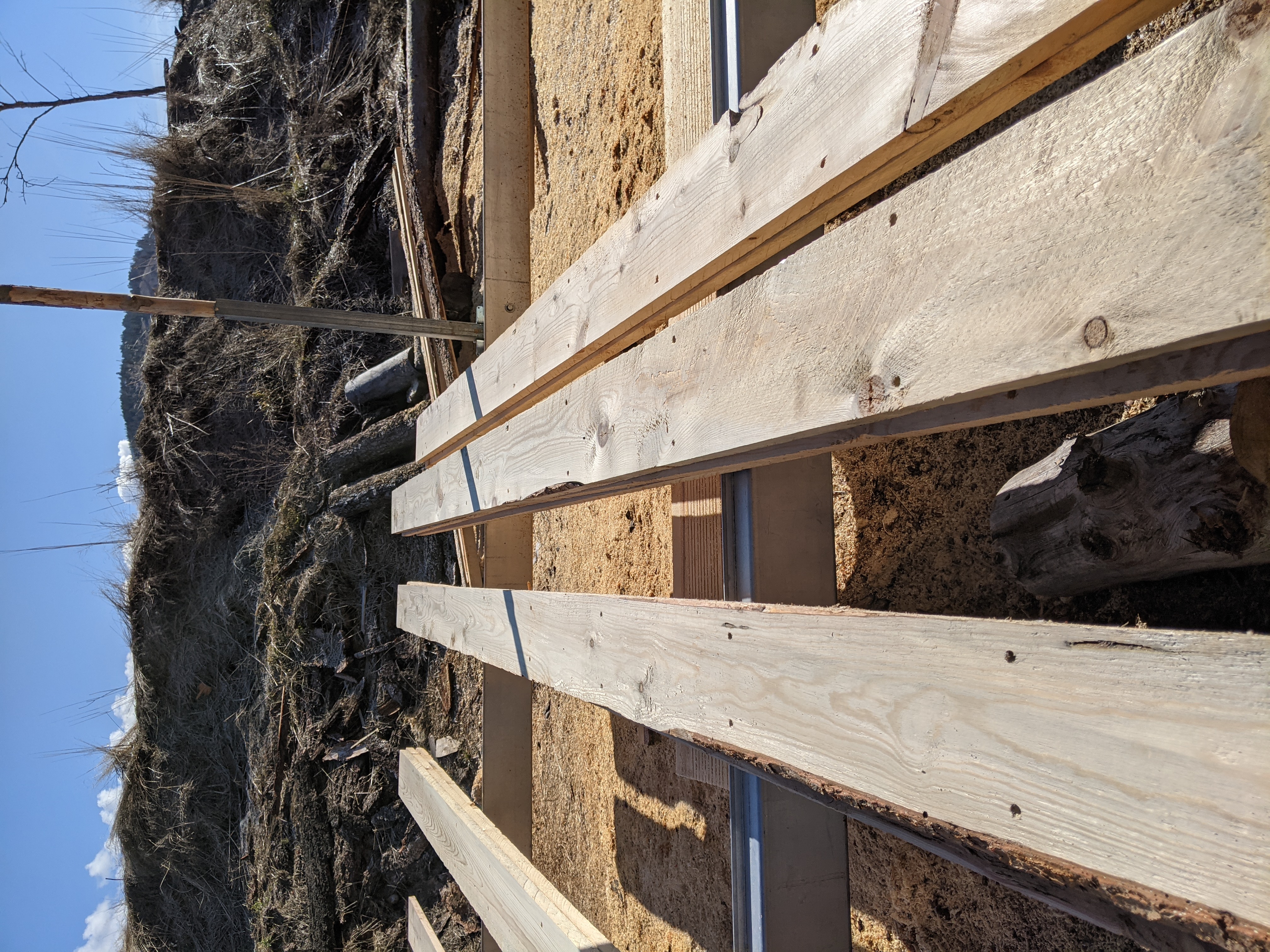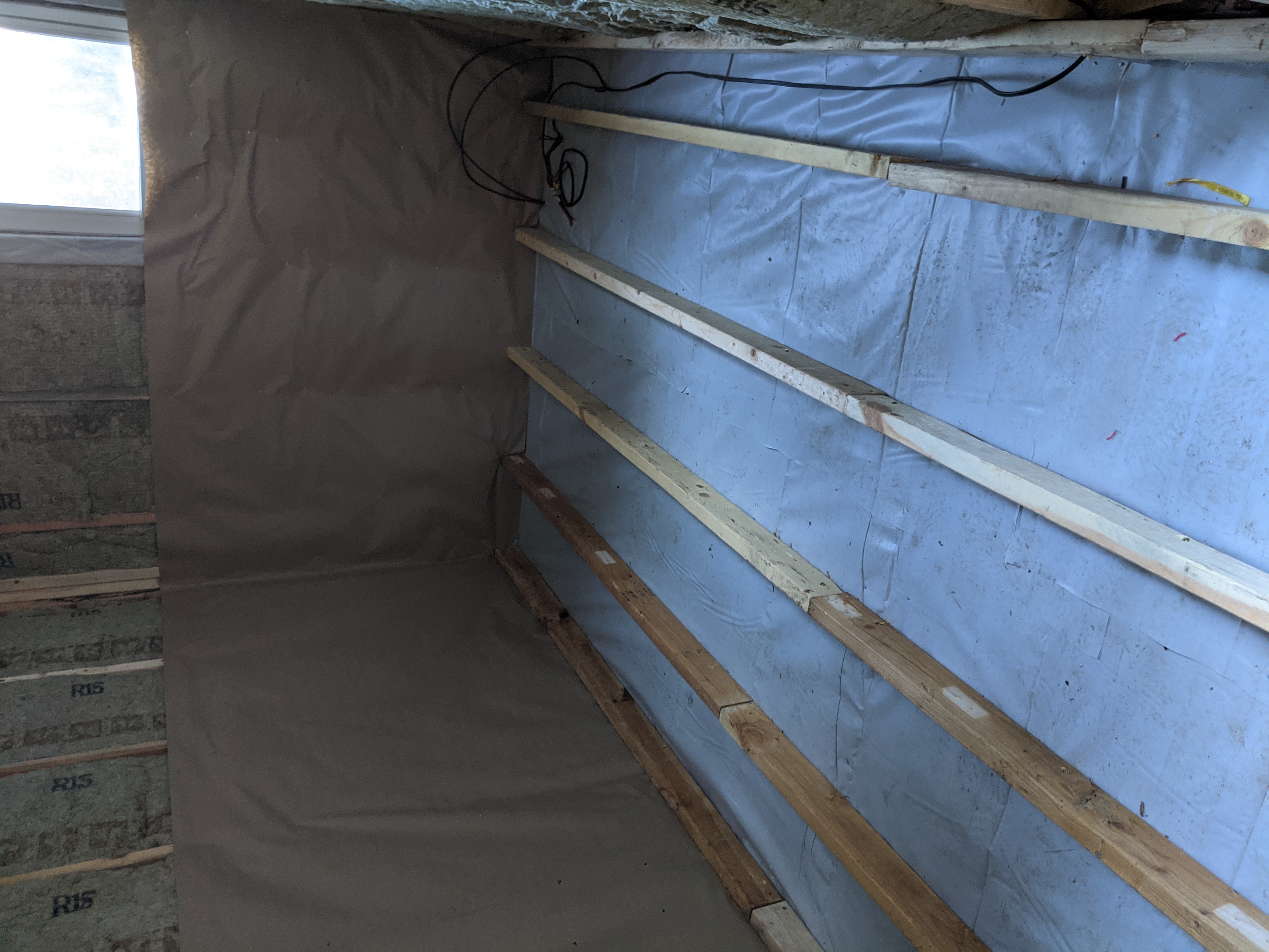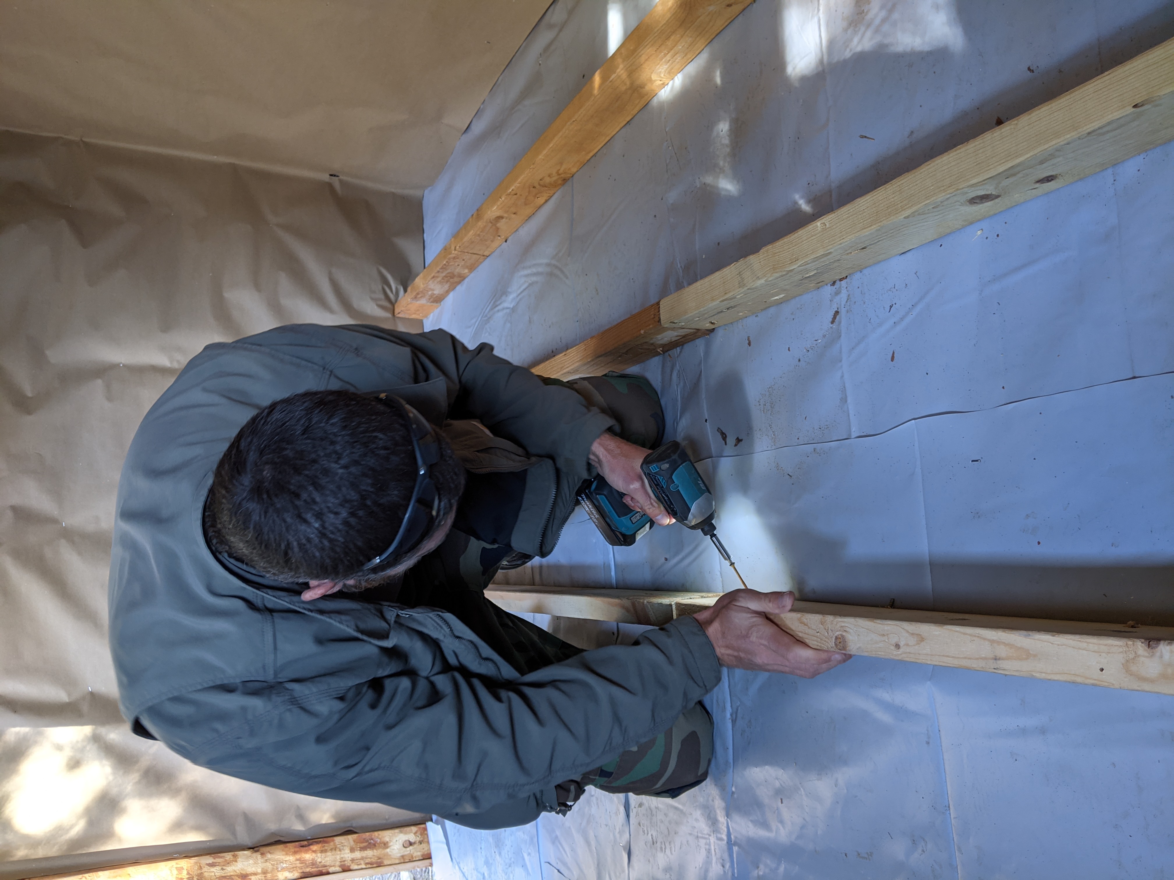 Next we got the plastic put down on the floor to prepare for our new floor joists. We found a bunch of 2x4s we can cobble together for the joists. We are going to hang some brown paper on the lower walls before we install the joists.