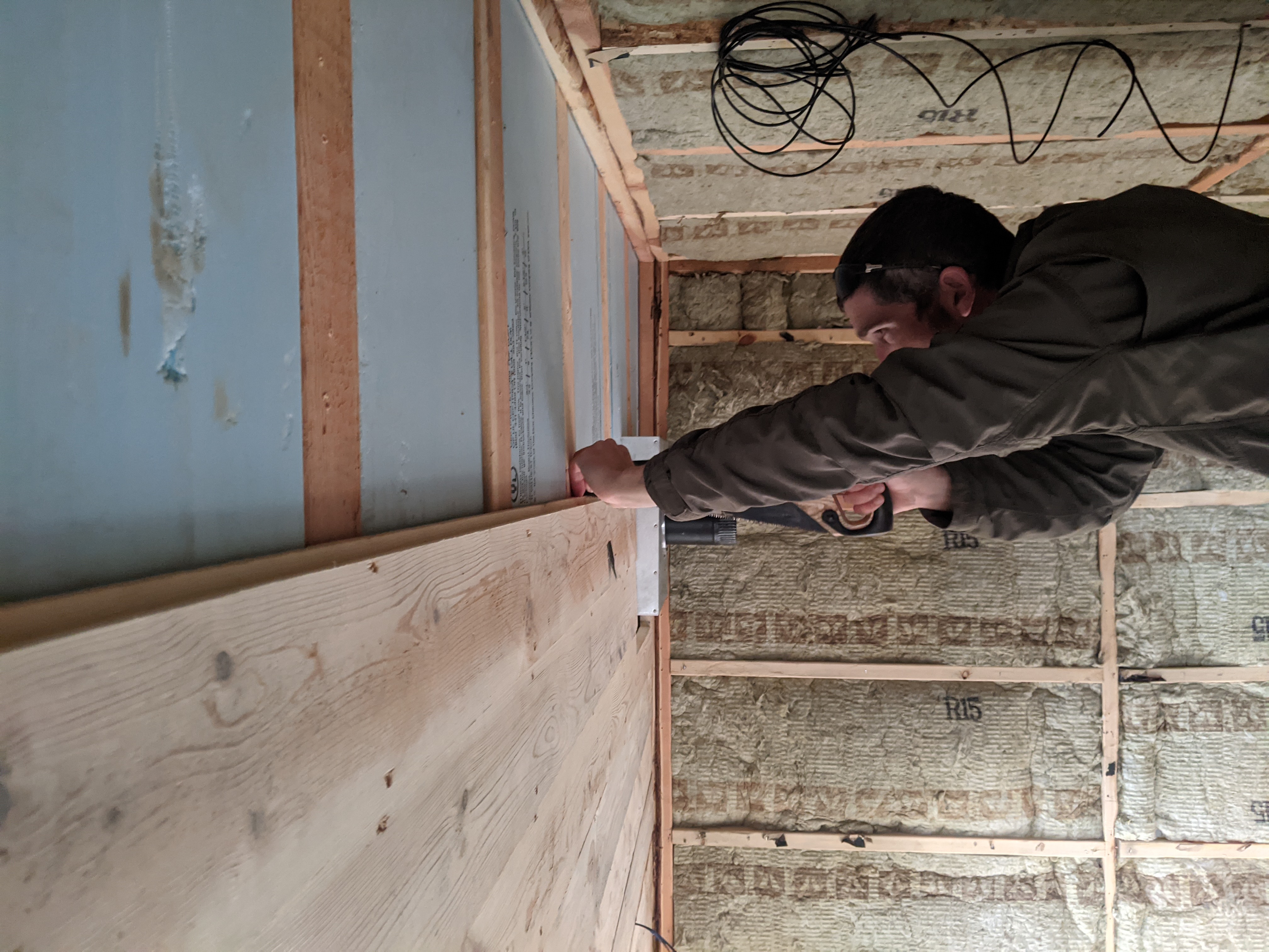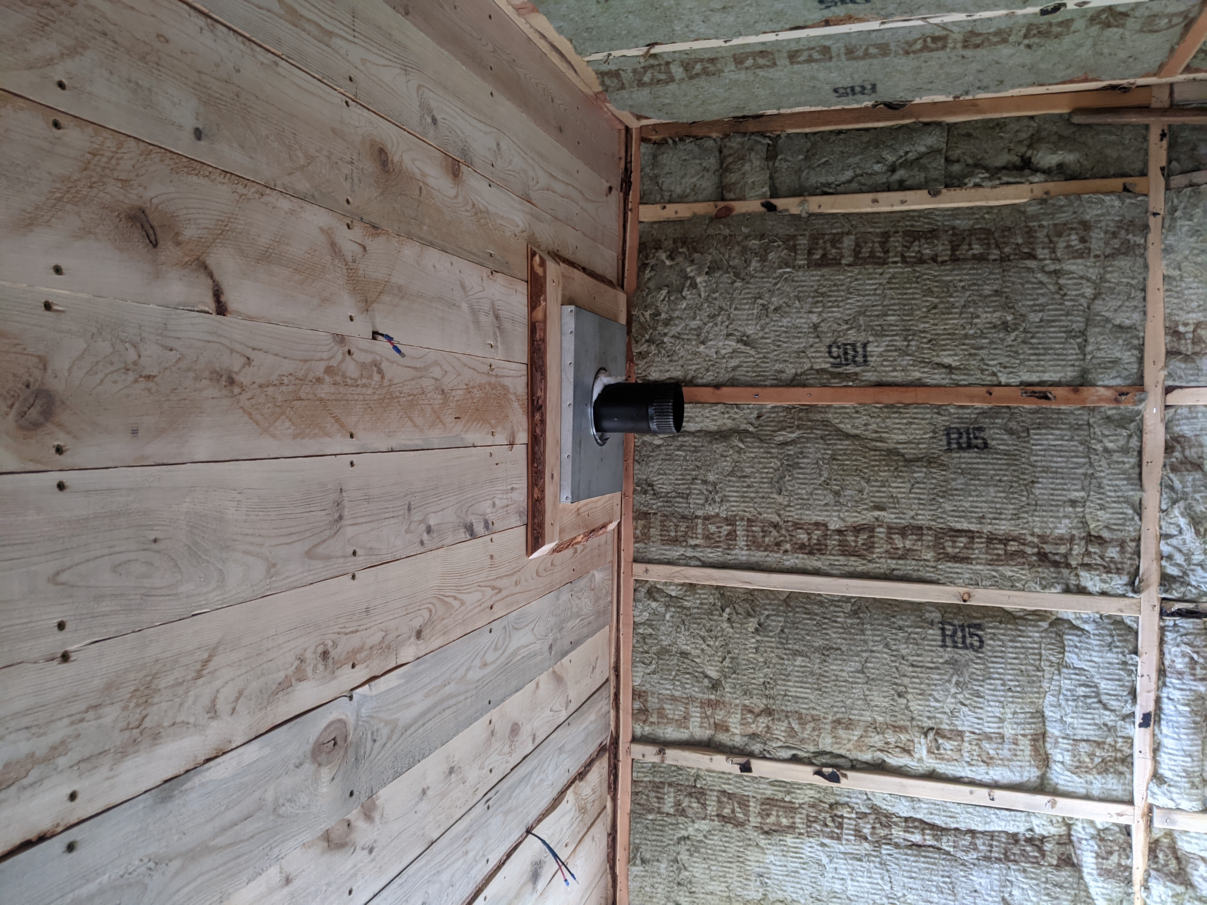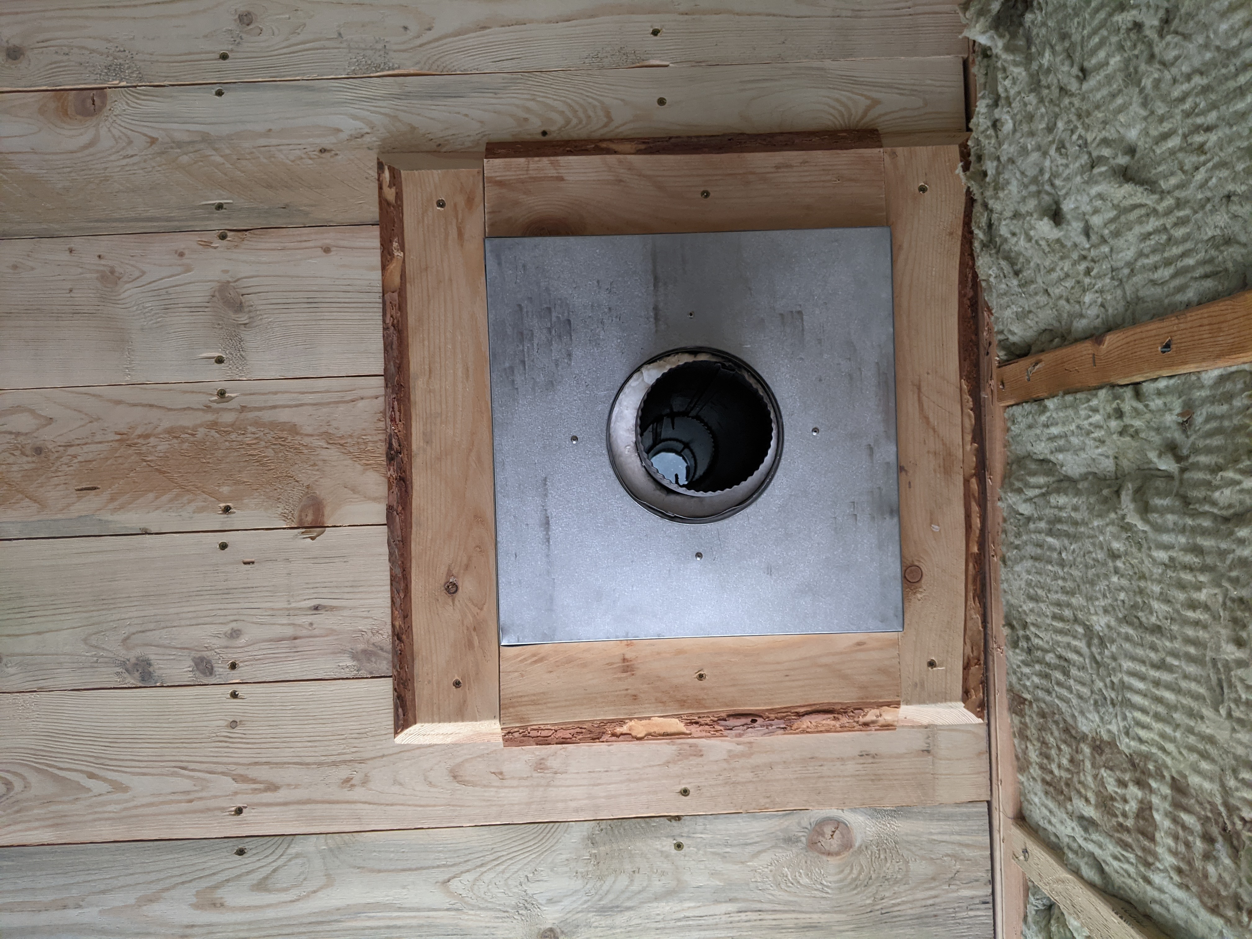 Yesterday Daniel and I were able to finish installing the ceiling boards. With an hour to spare, we decided to put the frame around the stove output to class up the place a bit. ππ It also covers the old notch in the board that no longer lined up with the box. There was also nothing to attach the wall side ceiling board pieces to, so framing it allowed us to handle that oversight.