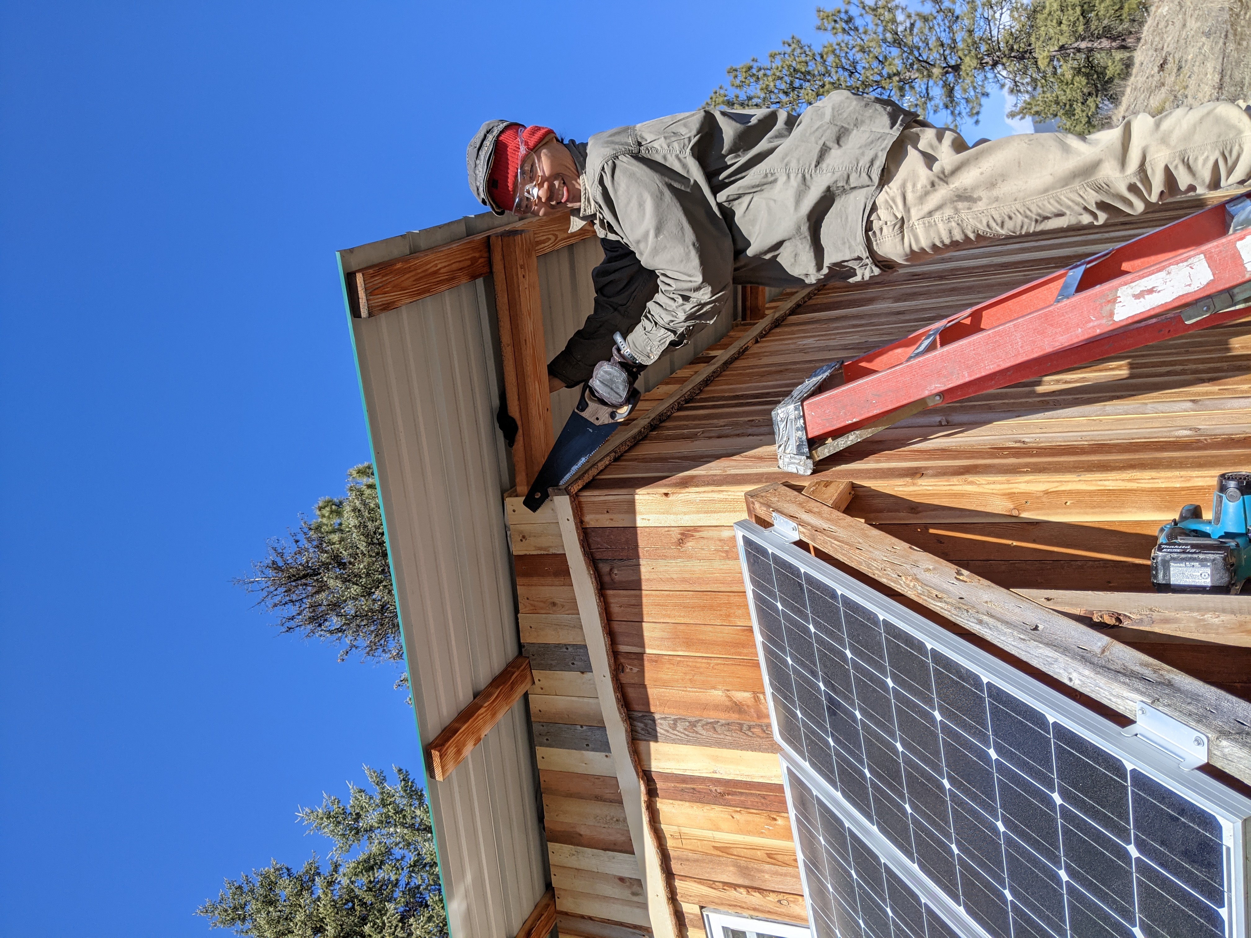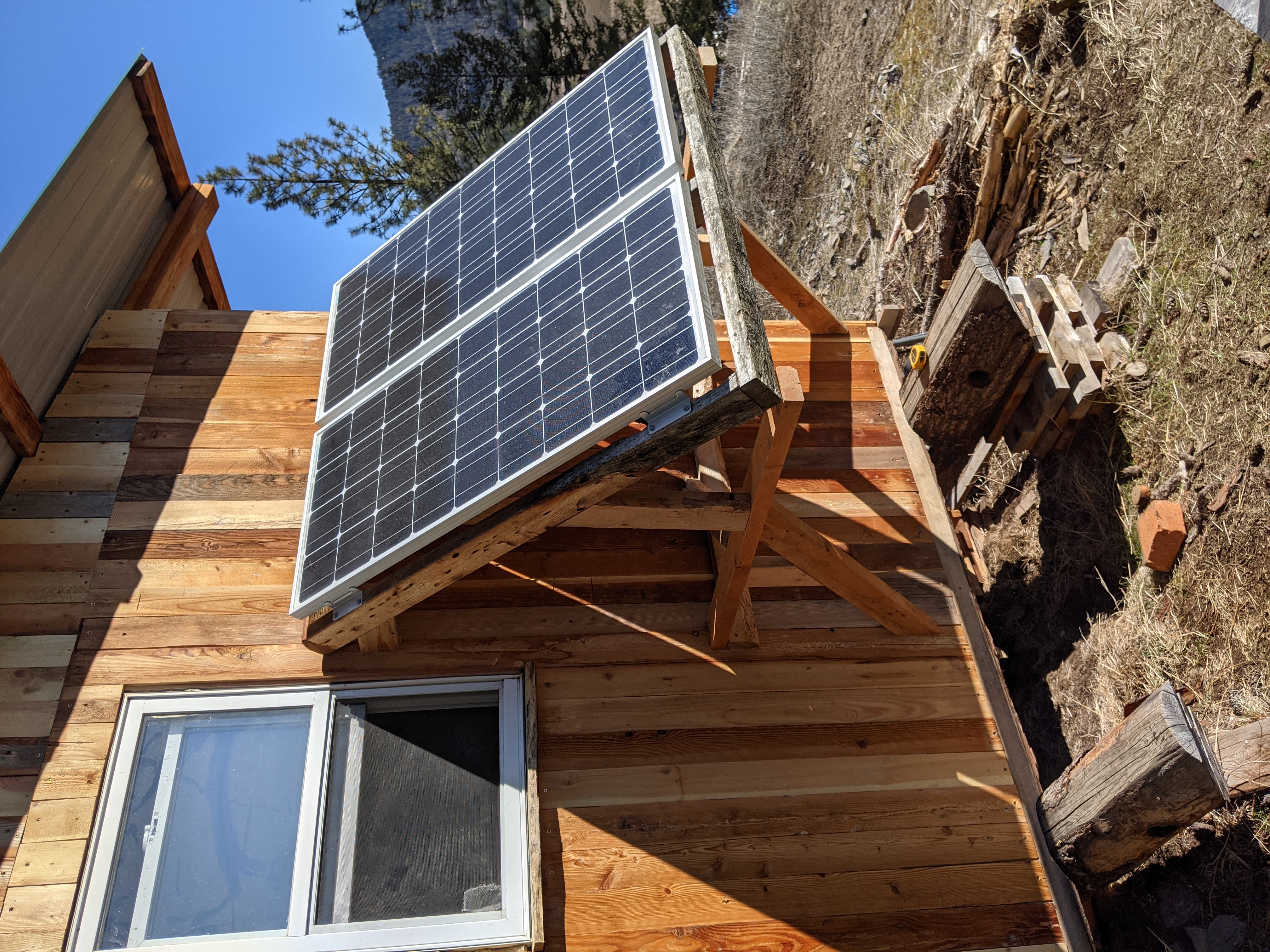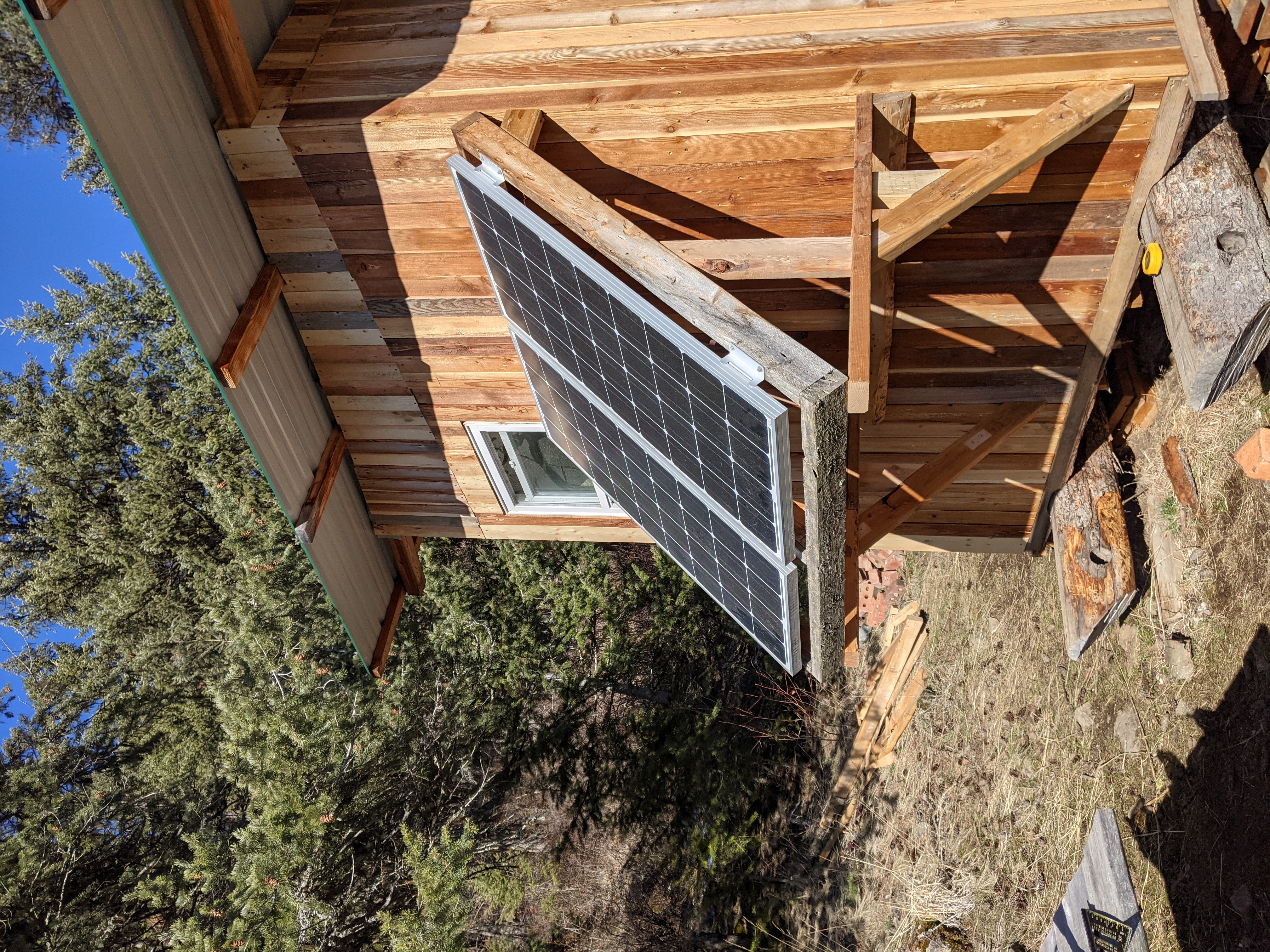 Today we rebuilt the solar support, added more support braces, and mounted the panels on the South side. Got a hole drilled for the wires to come up through the floor.